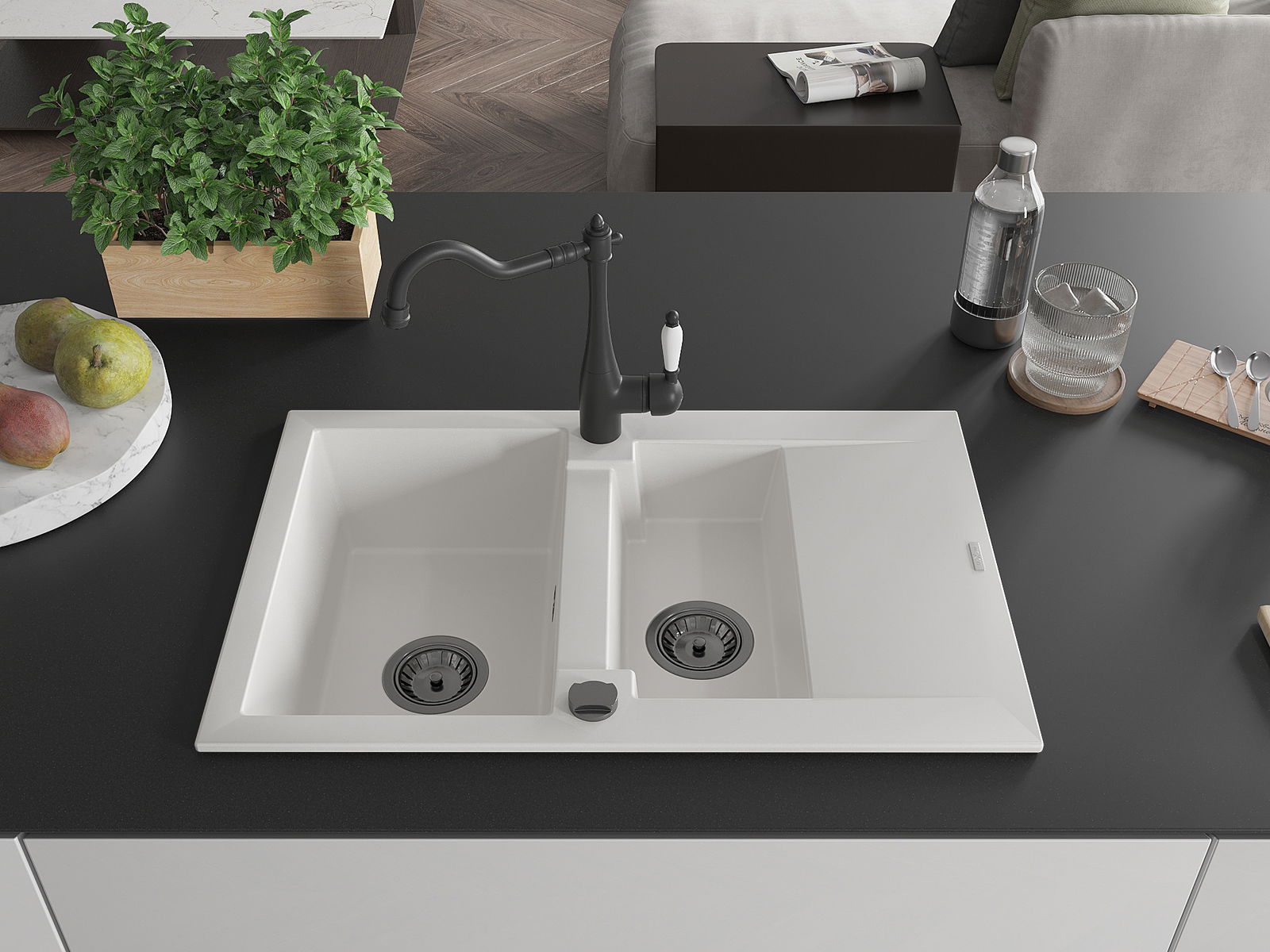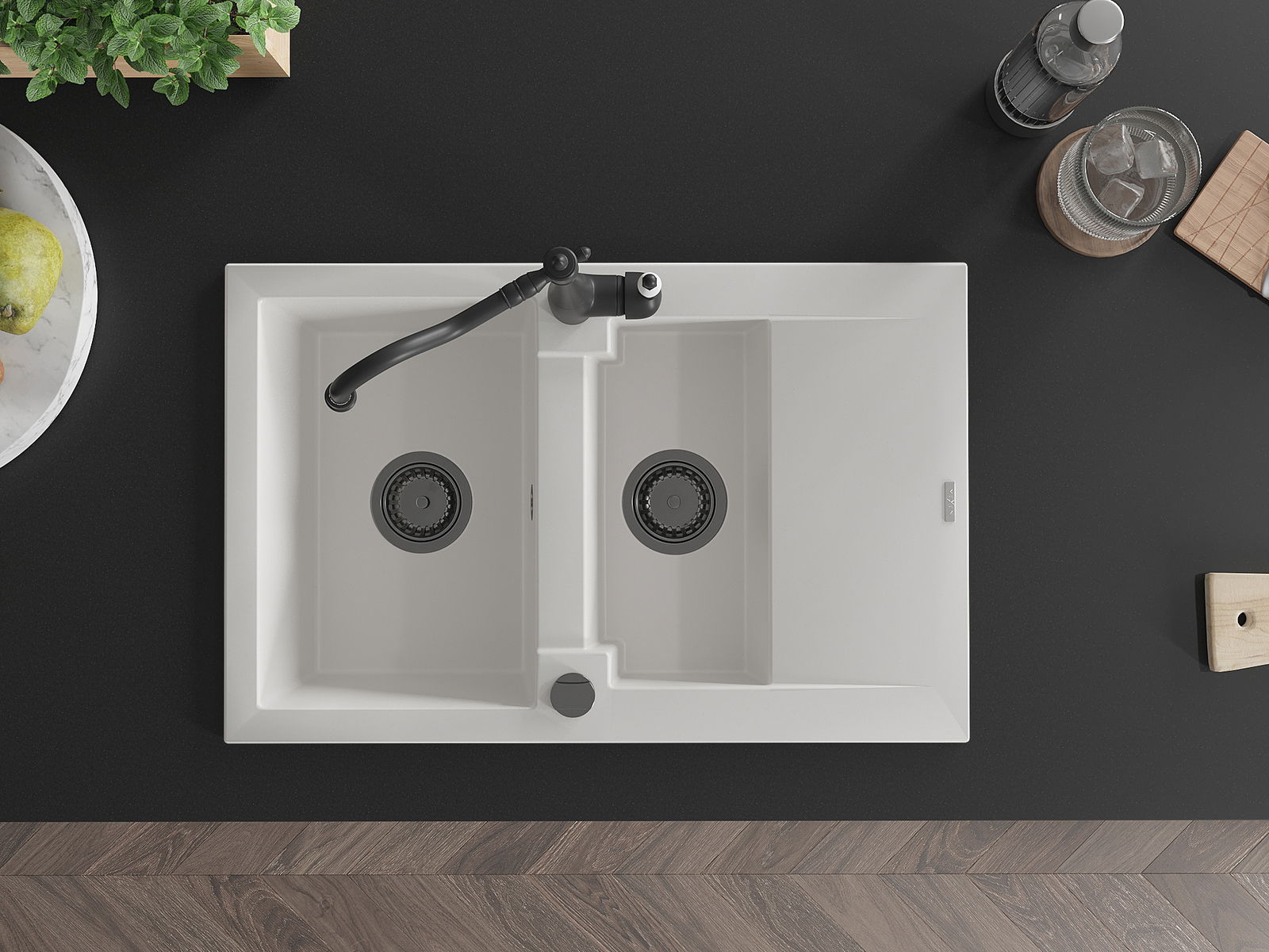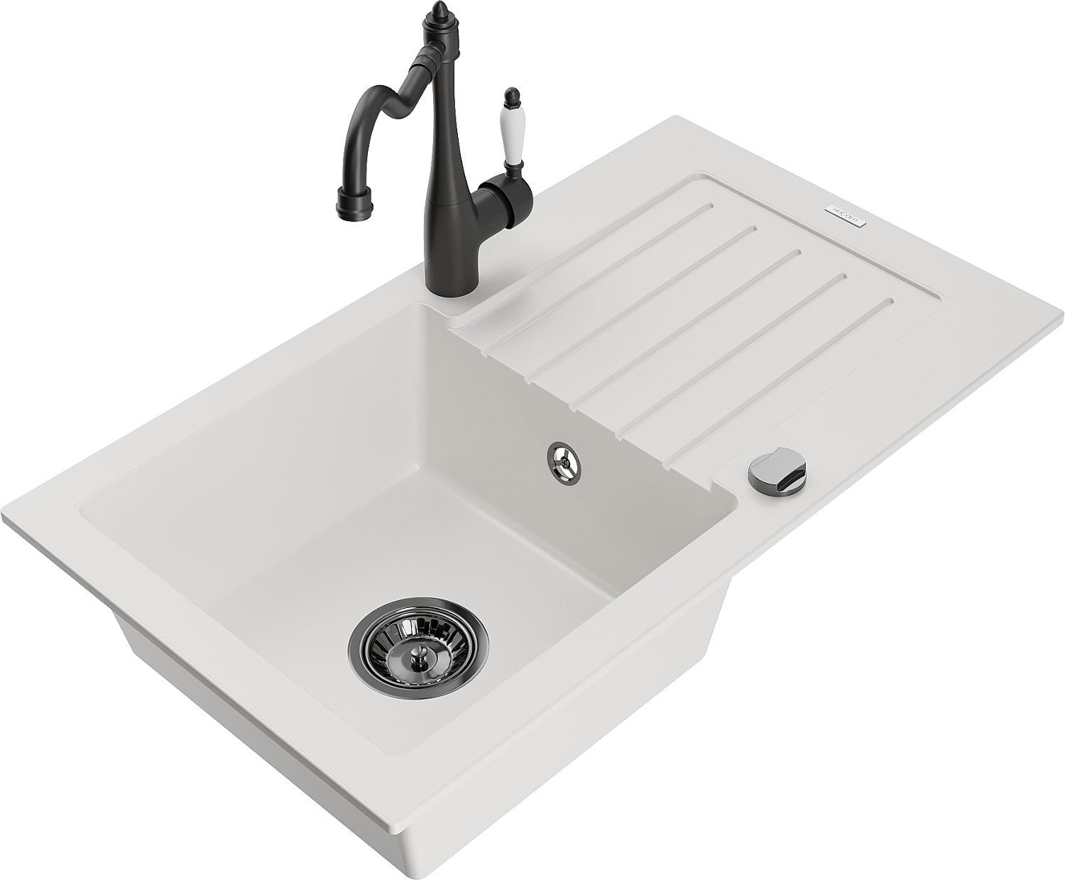 Mexen Pablo egymedencés gránit mosogató csepegtetővel és Carla konyhai csapteleppel, fehér - 6510-20-670700-70