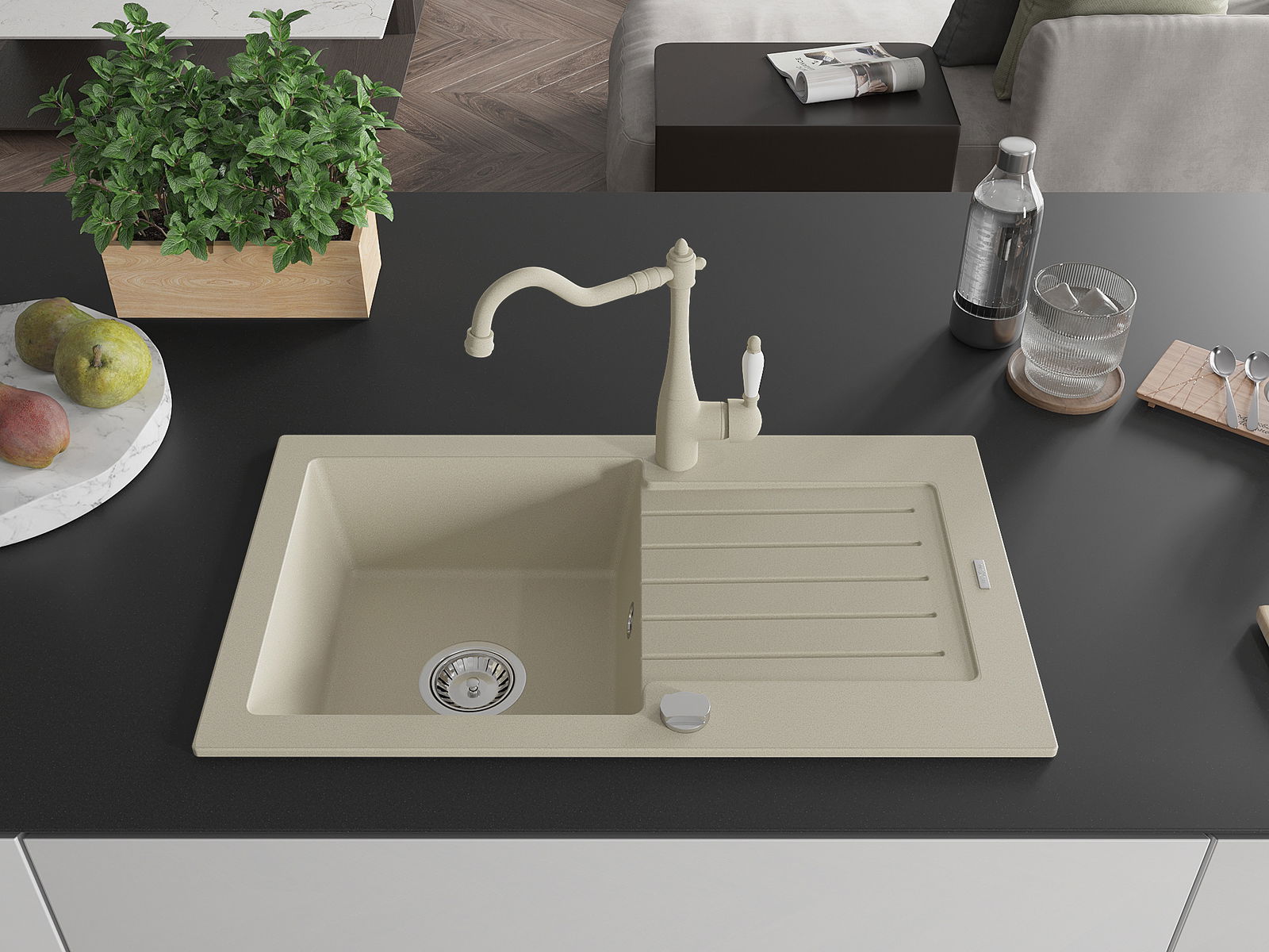 Mexen Pablo egymedencés gránit mosogató csepegtetővel és Carla konyhai csapteleppel, bézs - 6510-69-670700-69