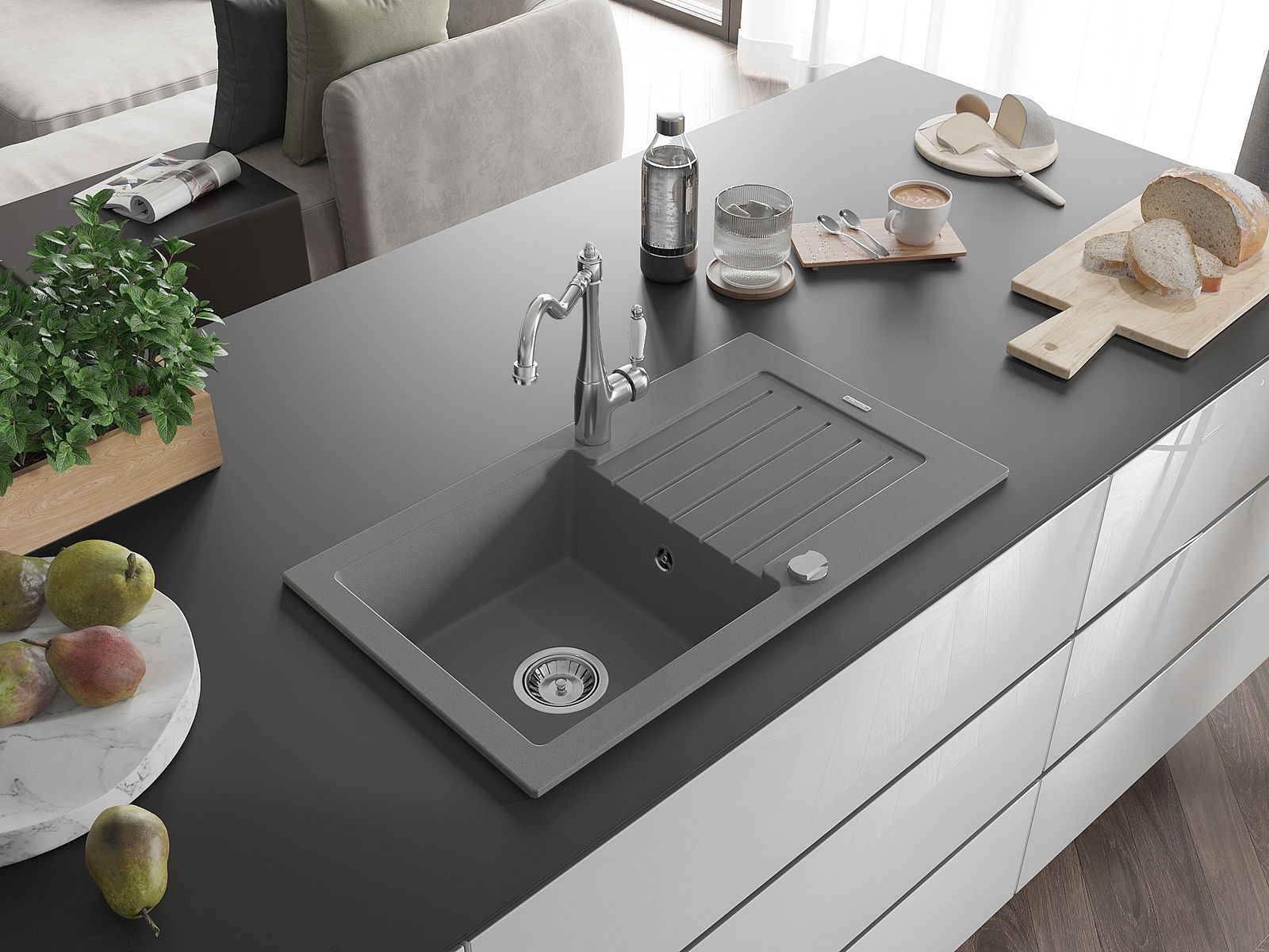 A mosogató kiváló minőségű gránitból készül. Ez egy elegáns és mindenekelőtt minden konyhához praktikus kiegészítés, stílusától függetlenül. A kiváló minőségű és a gránit tartósság biztosítja a sok éves használatát.