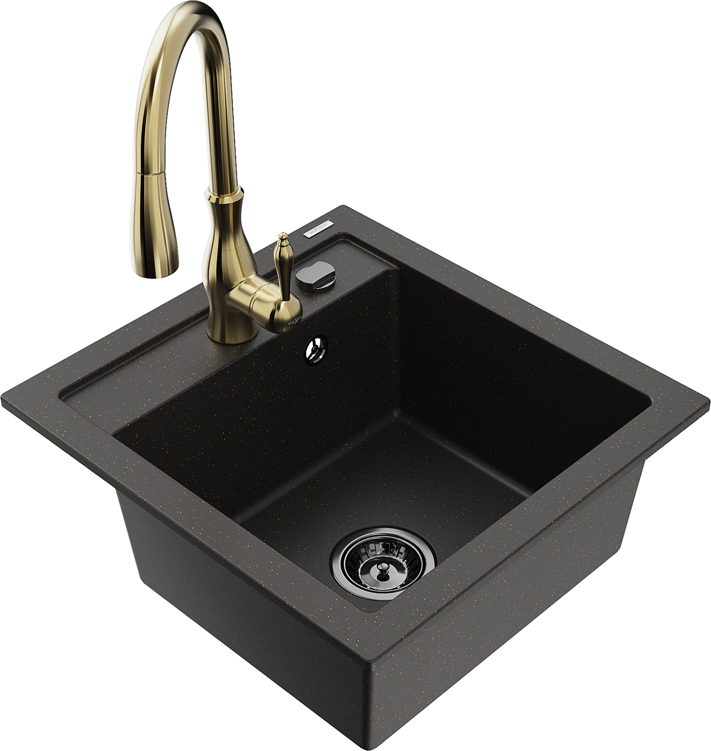 Mexen Vito egymedencés gránit mosogató Savita konyhai csapteleppel, fekete/arany metál - 6503-75-672601-50-B