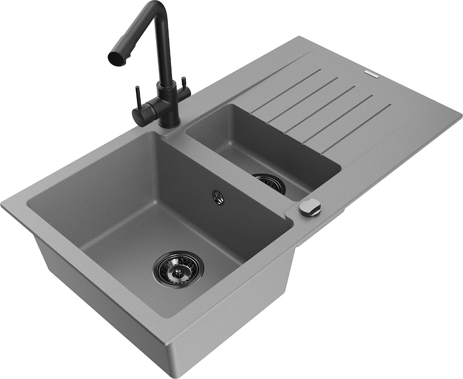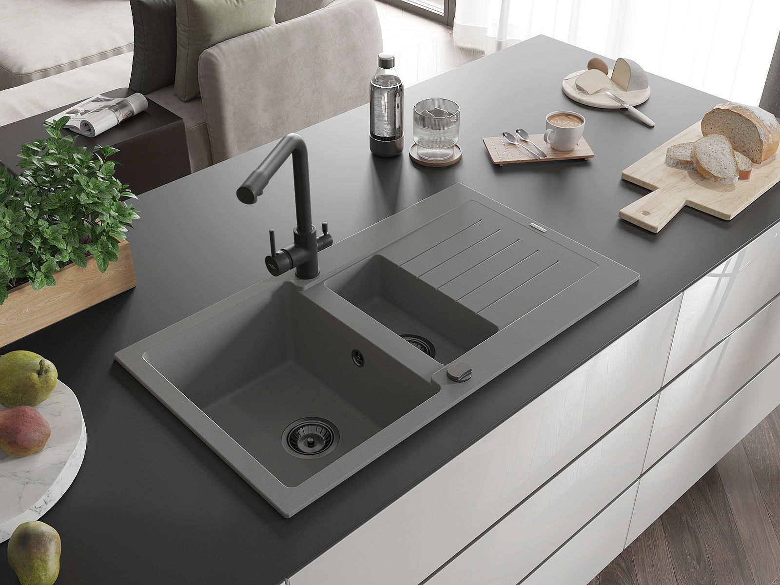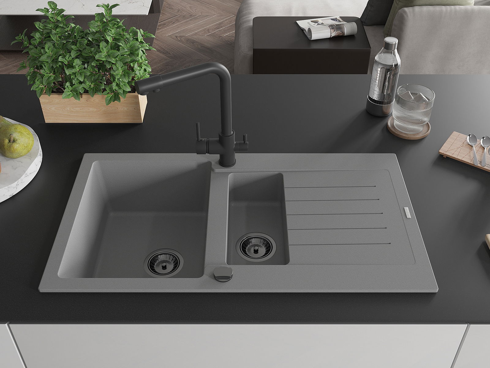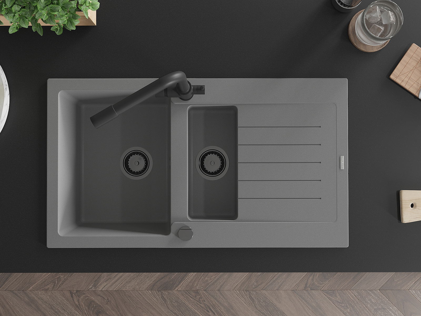 Mexen Matias 1,5 kamrás gránit mosogató csepegtetővel és Duero konyhai csapteleppel, szürke - 6502-71-671600-70-B