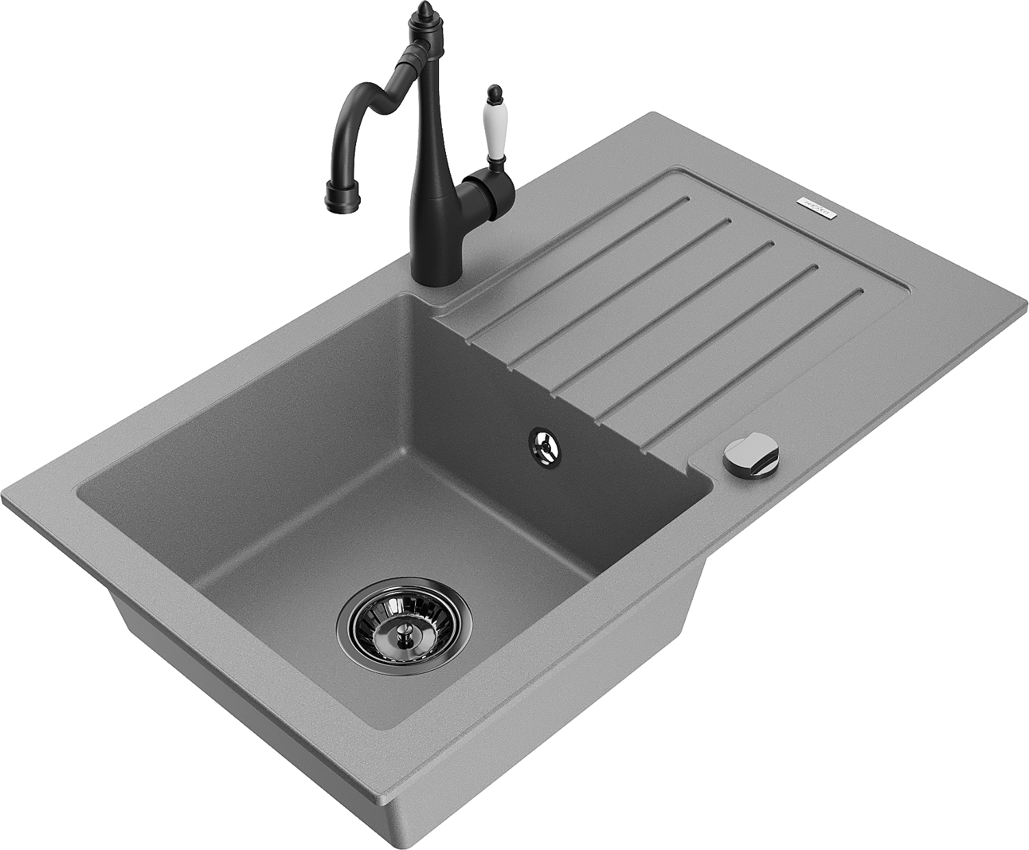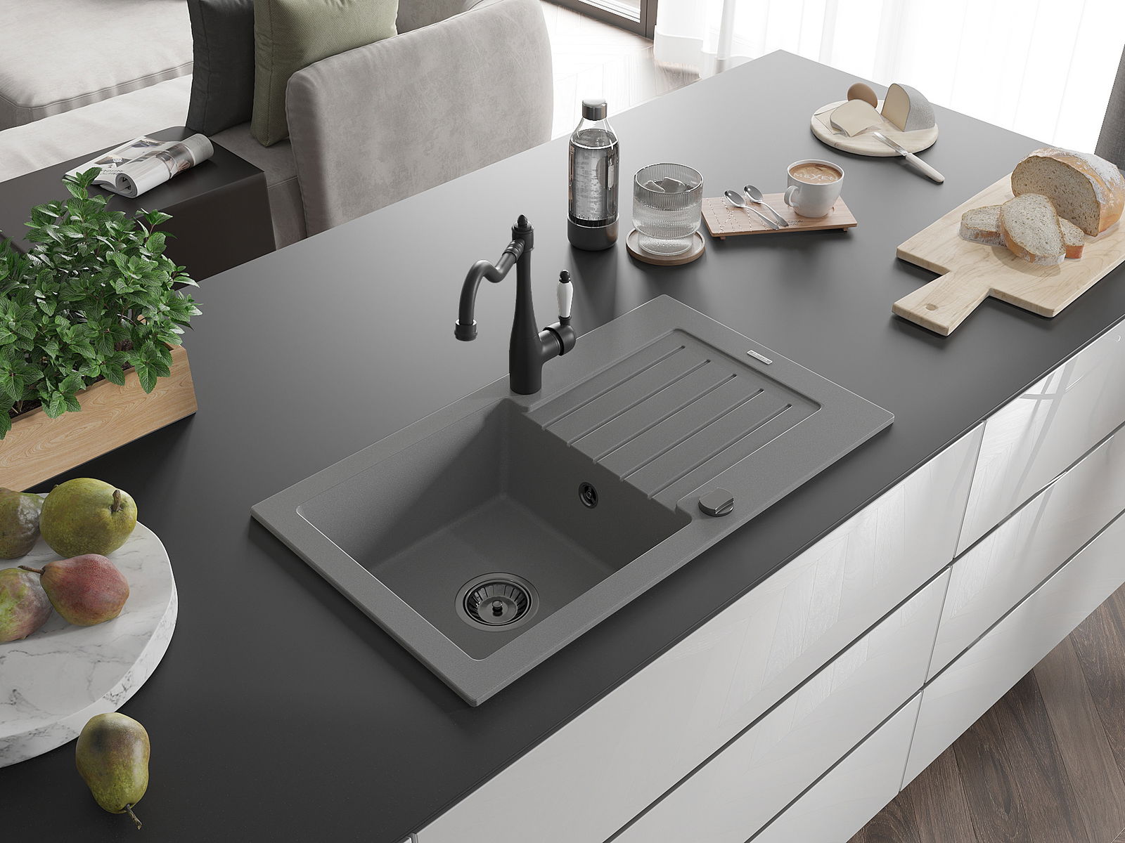 Mexen Pablo egymedencés gránit mosogató csepegtetővel és Carla konyhai csappal, szürke - 6510-71-670700-70-B