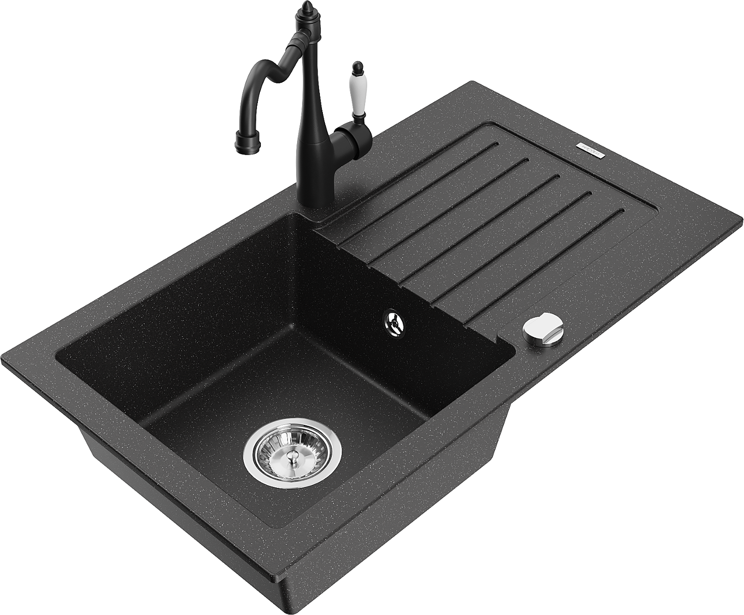 Mexen Pablo 1-kamrás gránit mosogató csepegtetővel és Carla konyhai csapteleppel, fekete/ezüst metál - 6510-73-670700-70