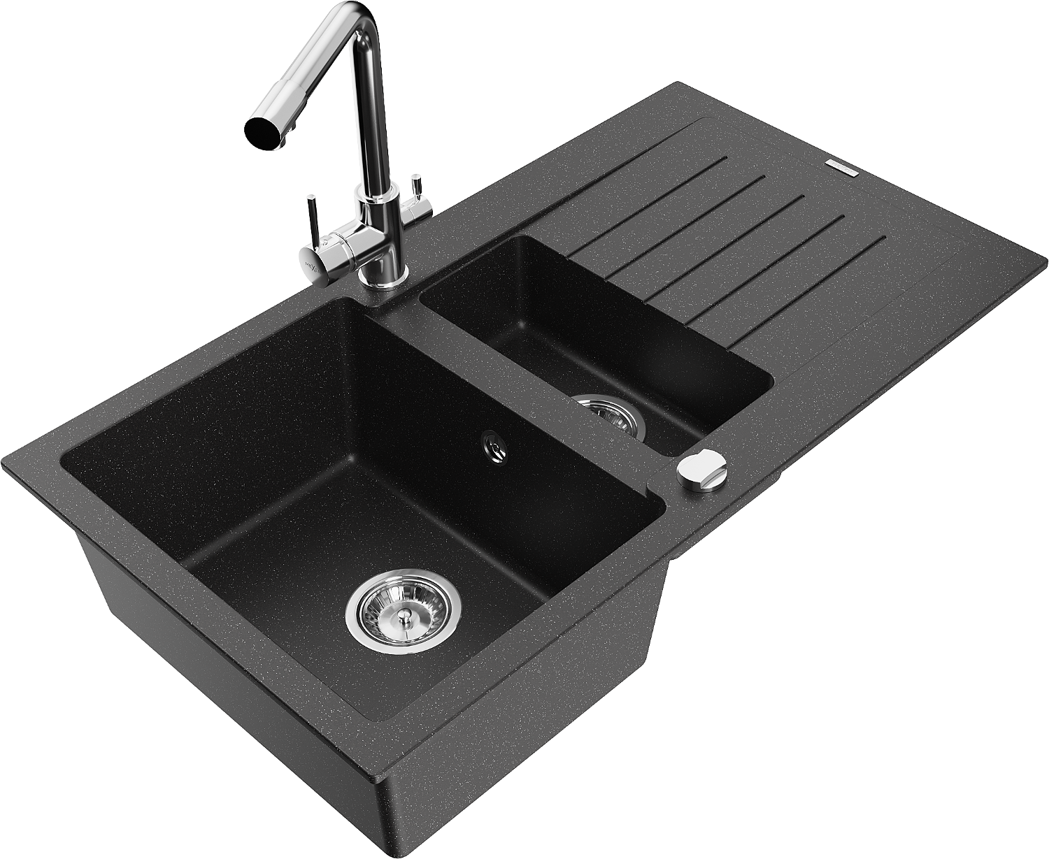 Mexen Matias gránit mosogató 1,5 rekeszes csepptálcával és Duero konyhai csapteleppel, fekete/ezüst metál - 6502-73-671600-00