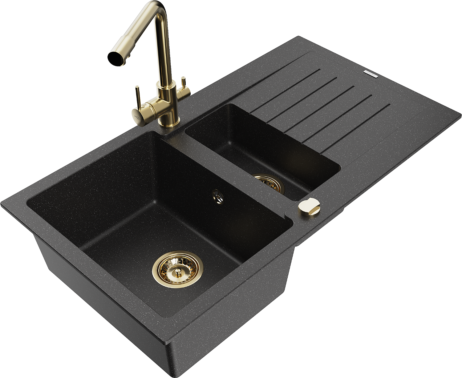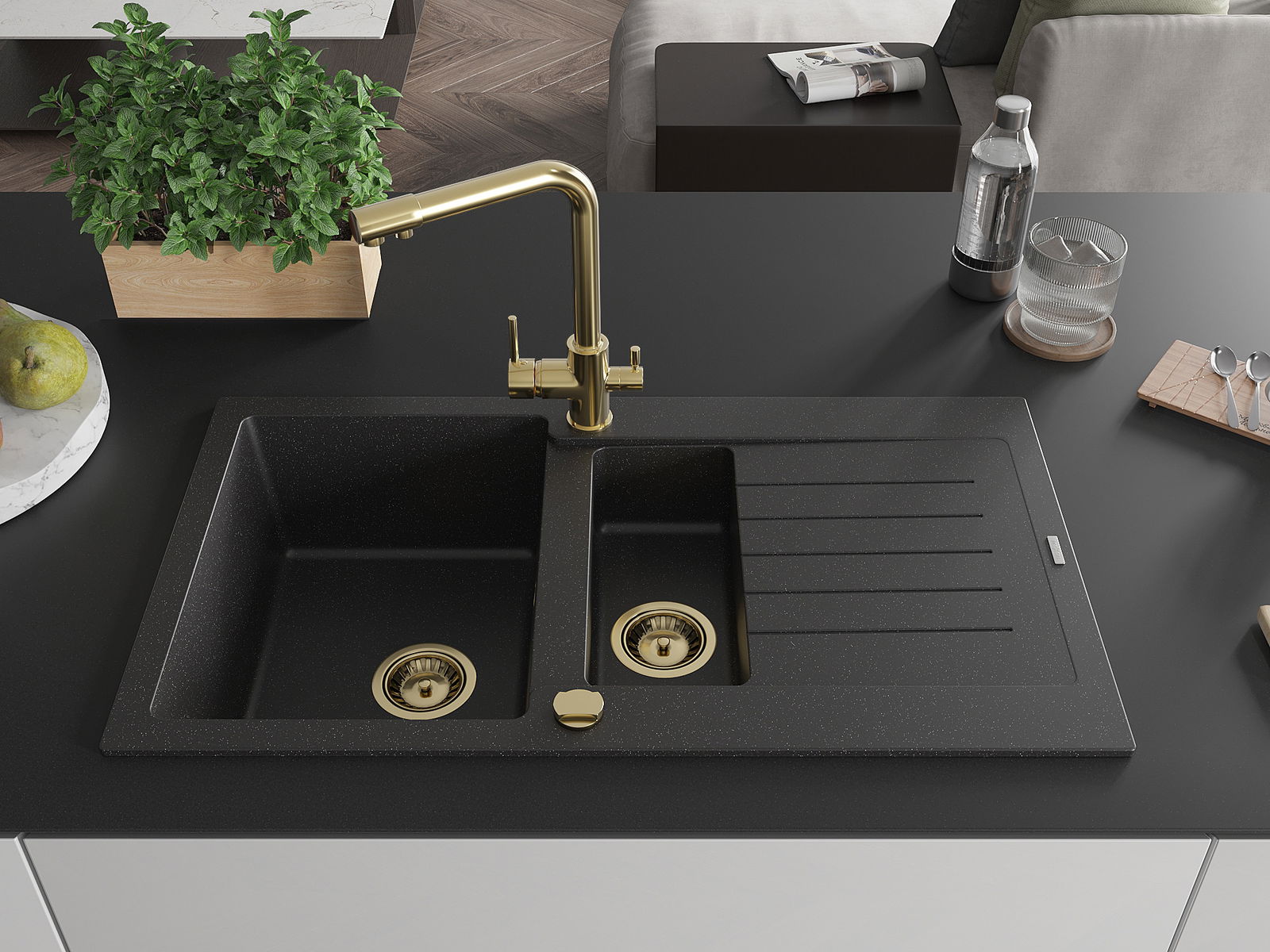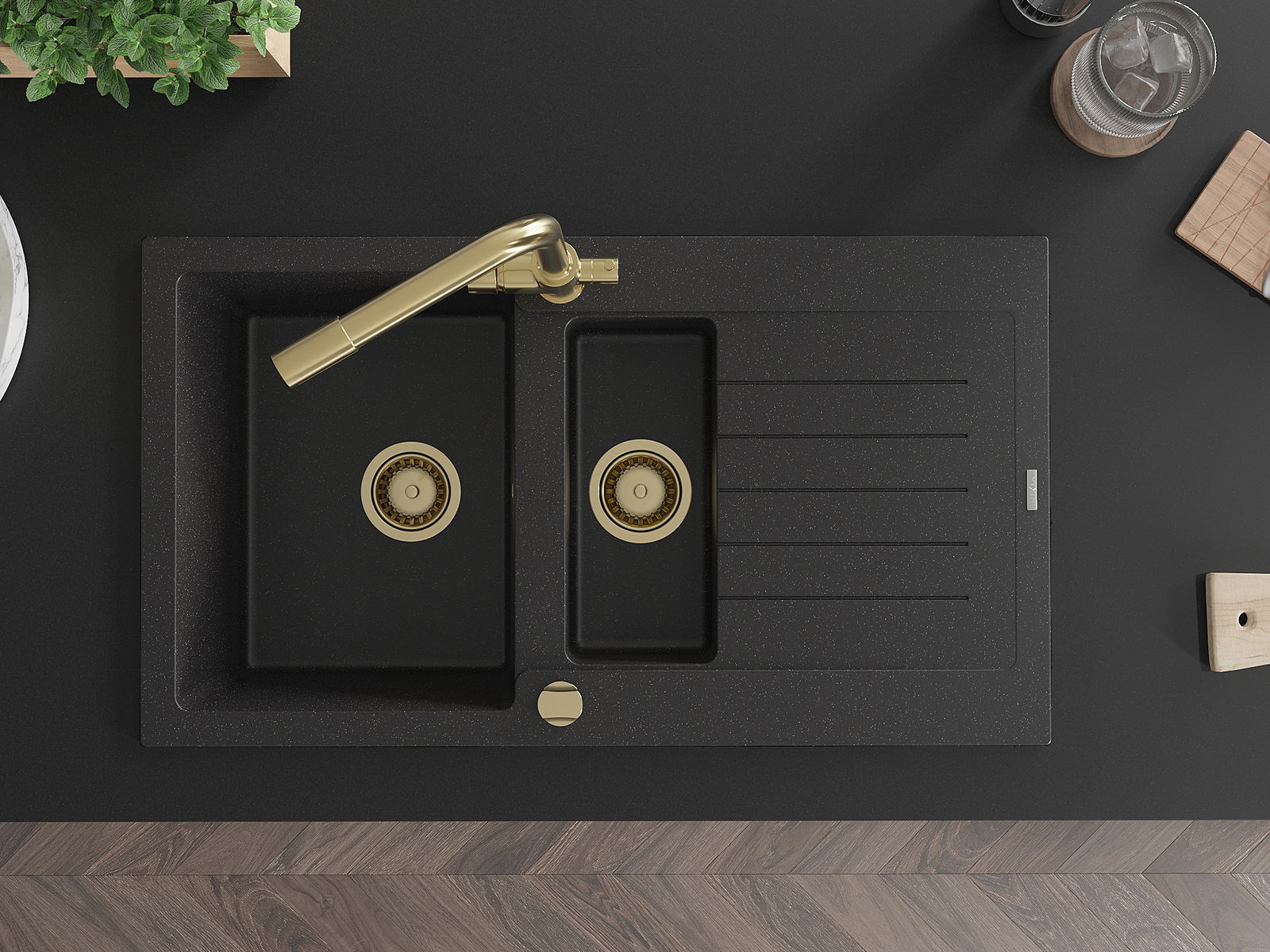 Mexen Matias 1,5-medencés gránit mosogató lefolyóval és Duero konyhai csapteleppel, fekete/ezüst metál - 6502-73-671600-50
