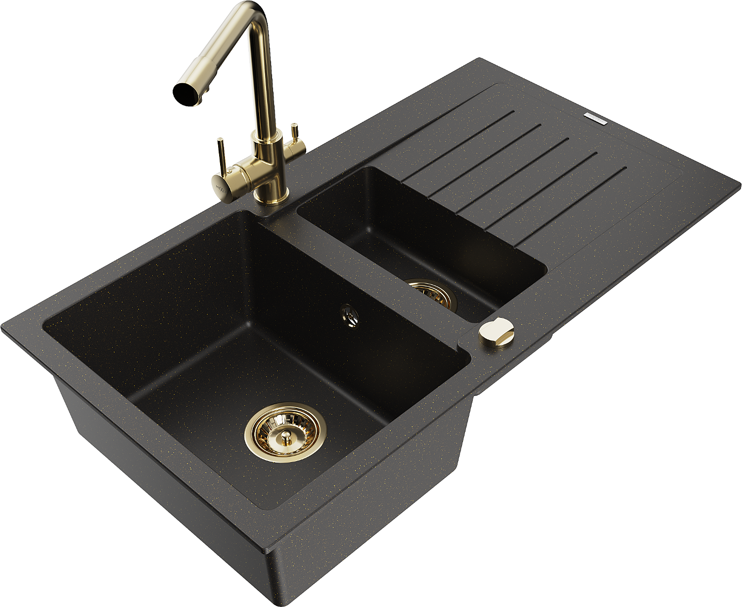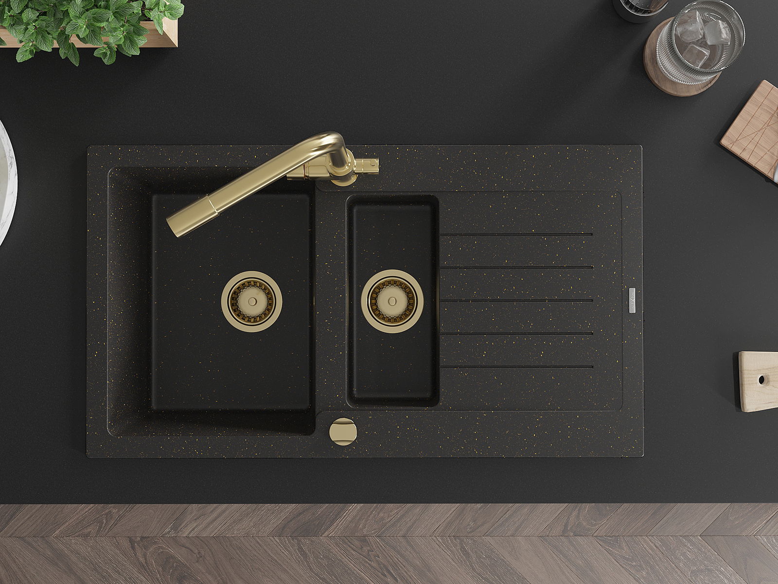 Mexen Matias gránit mosogató 1,5-medencés csepegtetővel és Duero konyhai csapteleppel, fekete/arany metál - 6502-75-671600-50