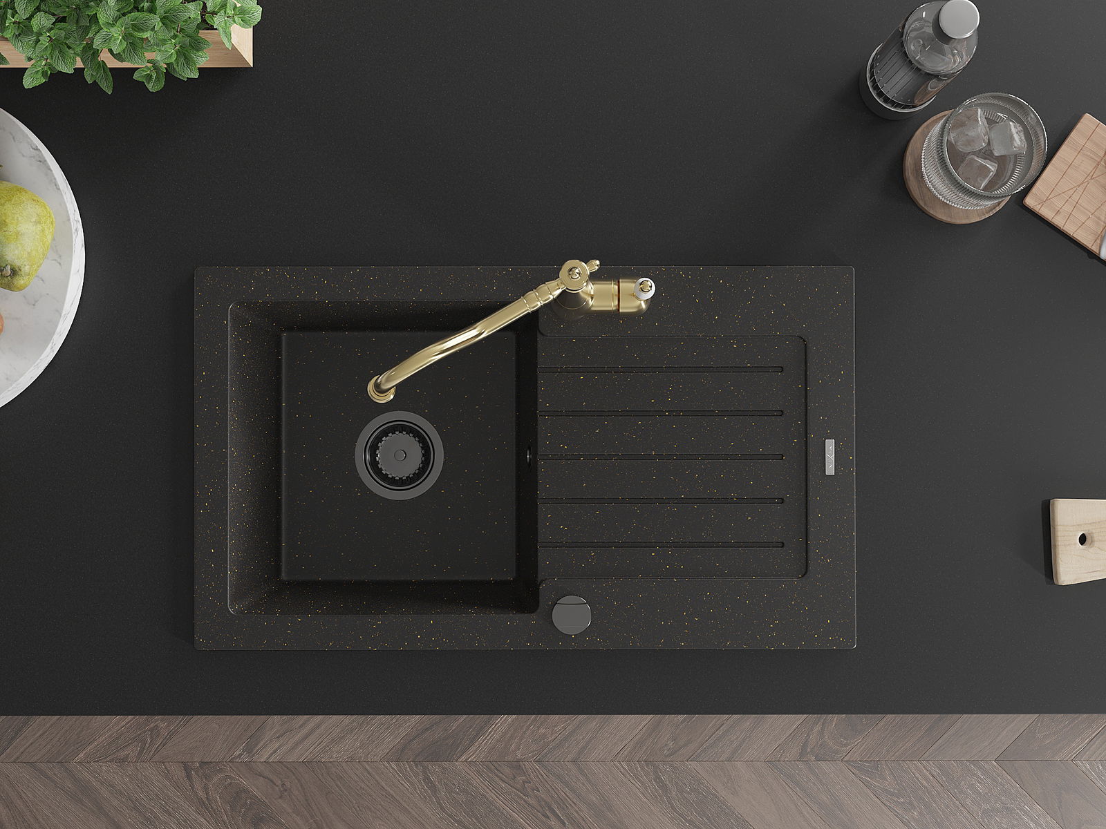 Mexen Pablo gránit mosogató, 1 medencés, lefolyóval és Carla konyhai csapteleppel, fekete/arany metál - 6510-75-670700-50-B