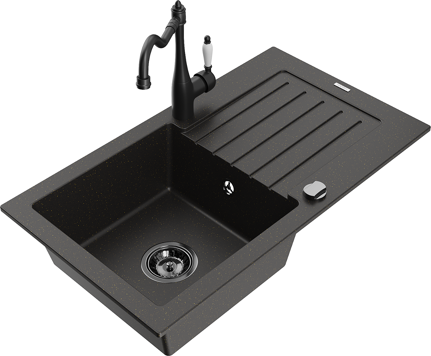 Mexen Pablo gránit mosogató 1-medencés csepegtetővel és Carla konyhai csapteleppel, fekete/arany metál - 6510-75-670700-70-B