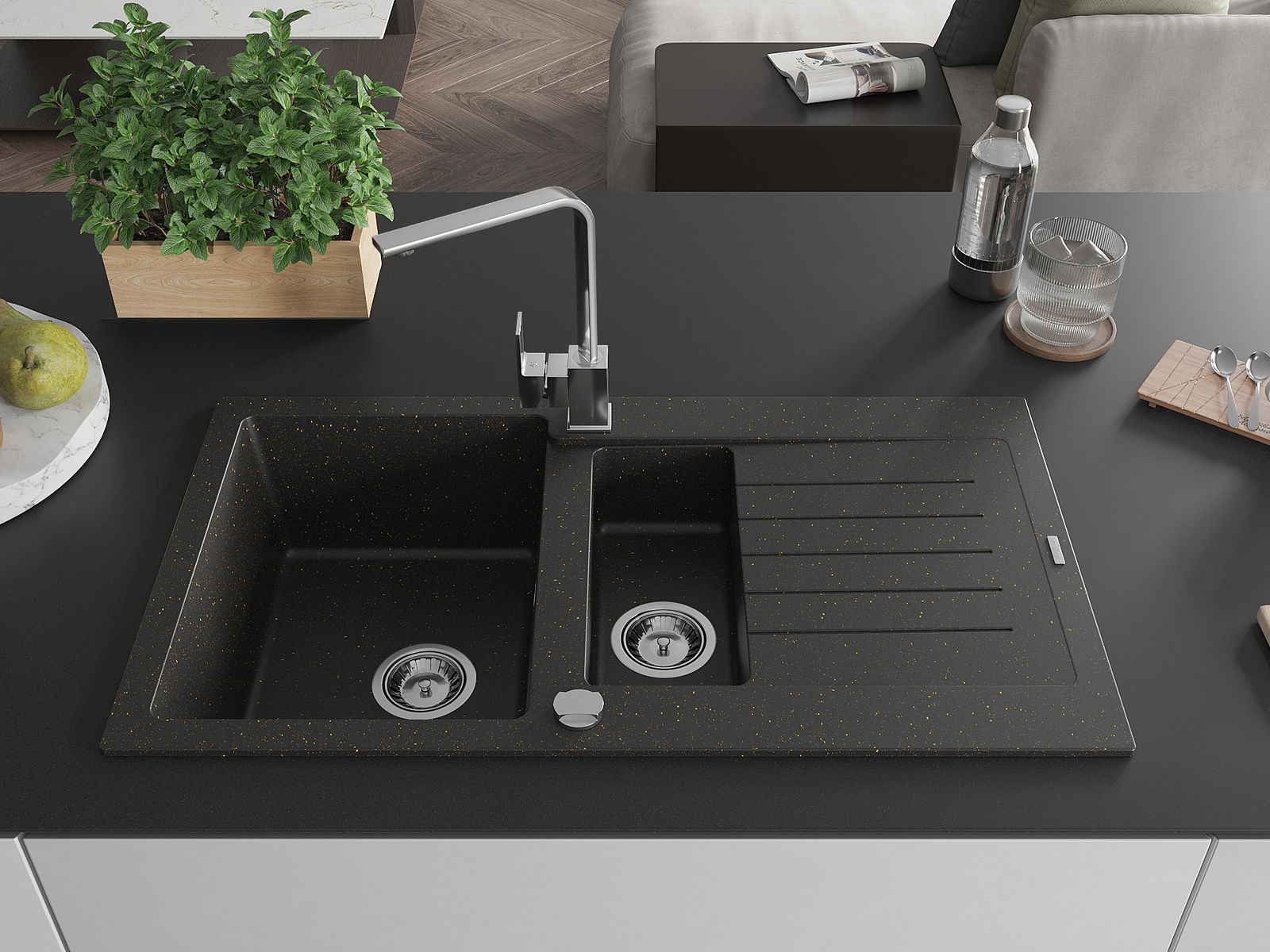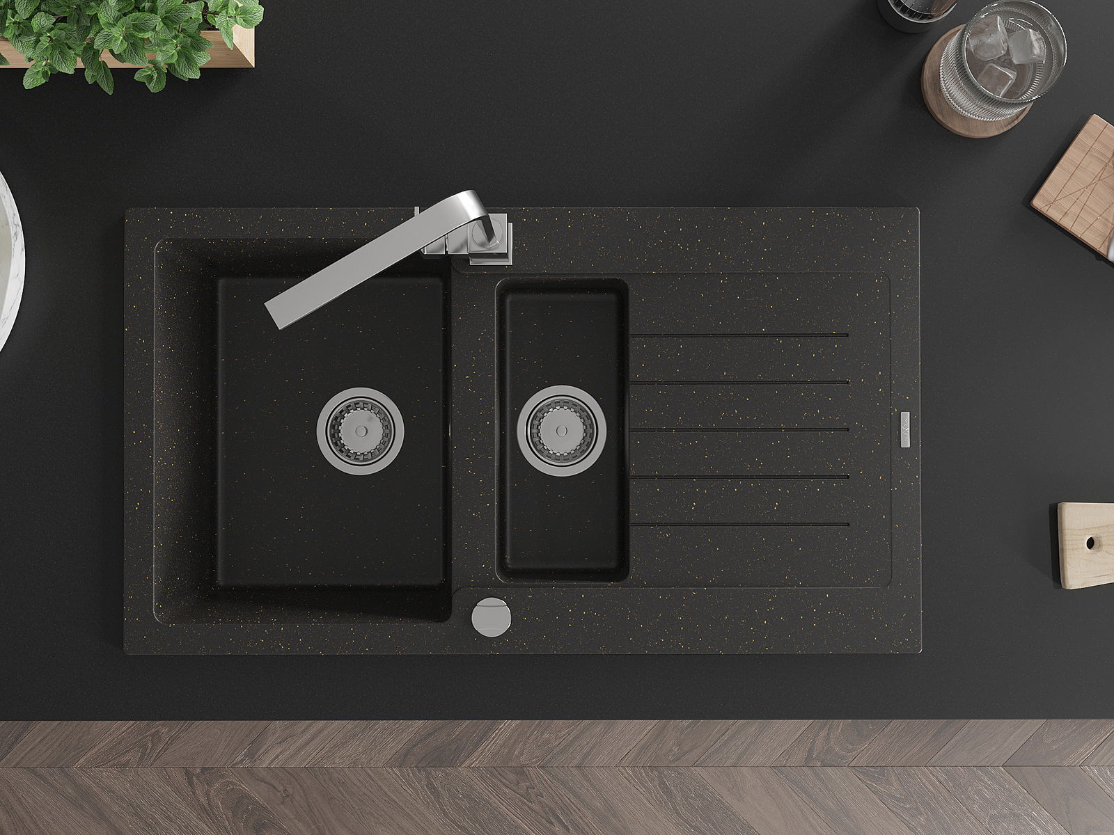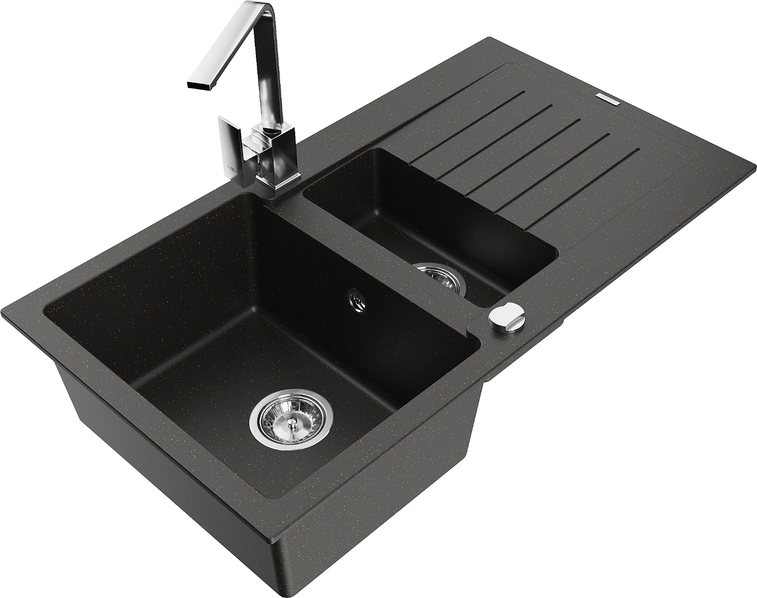 Mexen Matias 1,5-medencés gránit mosogató csepegtetővel és Rita konyhai csapteleppel, fekete/arany - 6502-75-670300-00