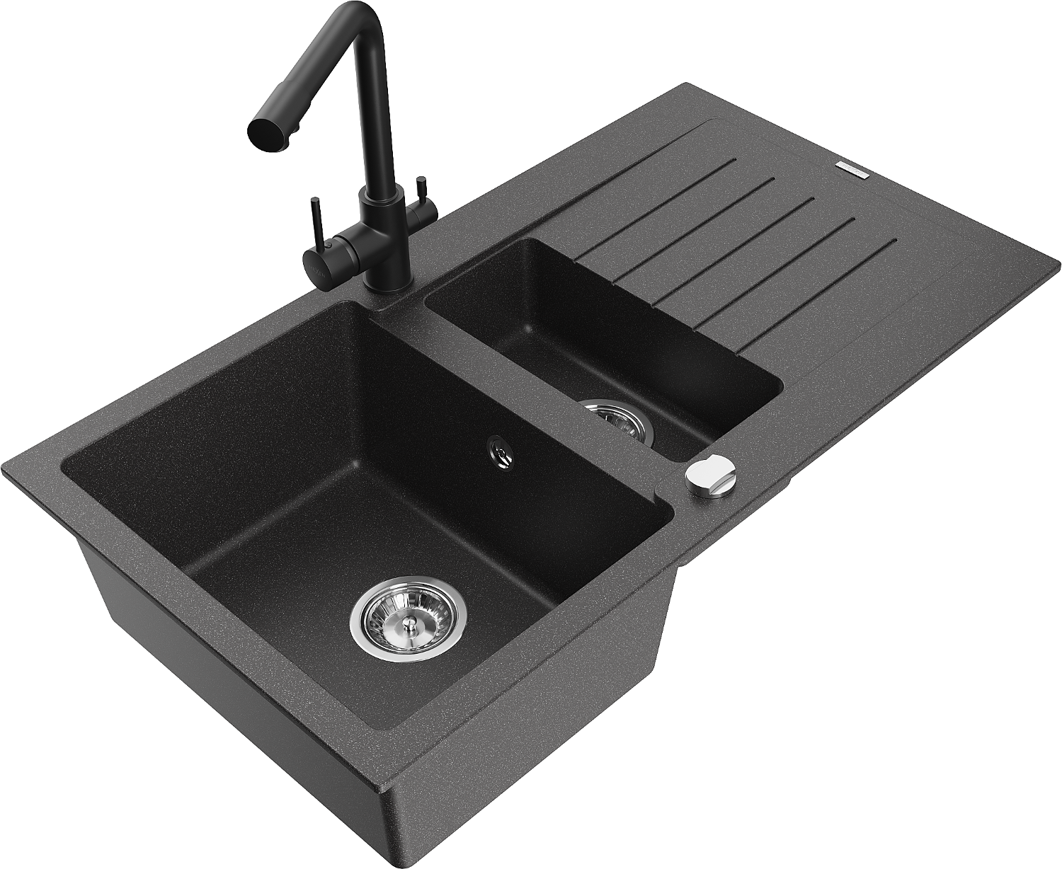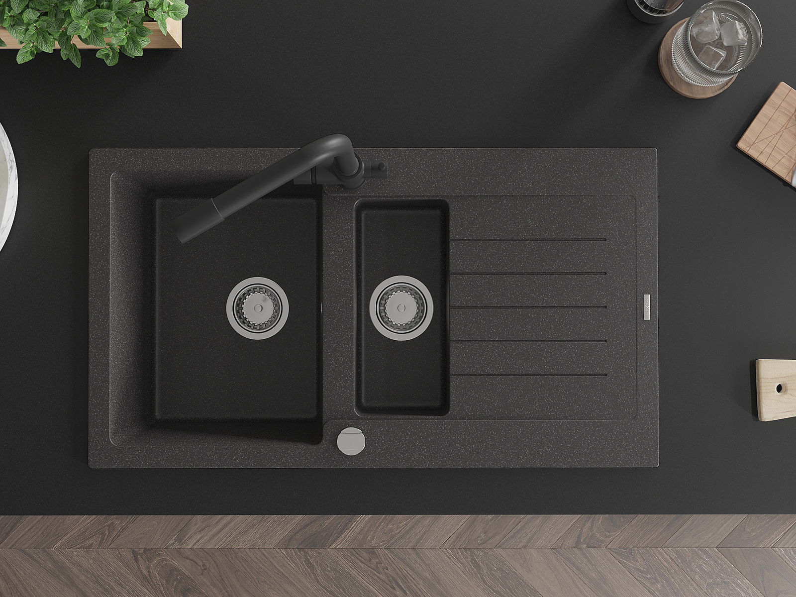 Mexen Matias gránit mosogató 1,5 medencés csepegtetővel és Duero konyhai csapteleppel, fekete pettyes - 6502-76-671600-70