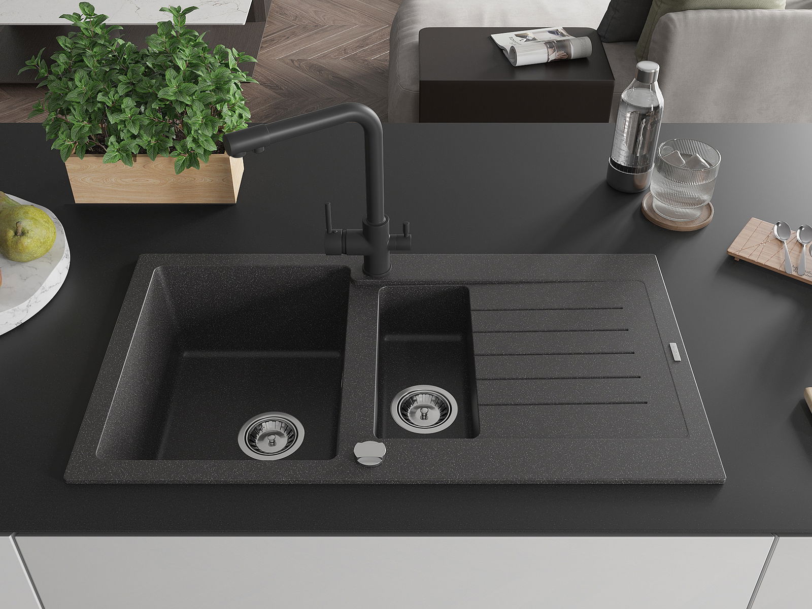 A mosogató kiváló minőségű gránitból készül. Ez egy elegáns és mindenekelőtt minden konyhához praktikus kiegészítés, stílusától függetlenül. A kiváló minőségű és a gránit tartósság biztosítja a sok éves használatát.