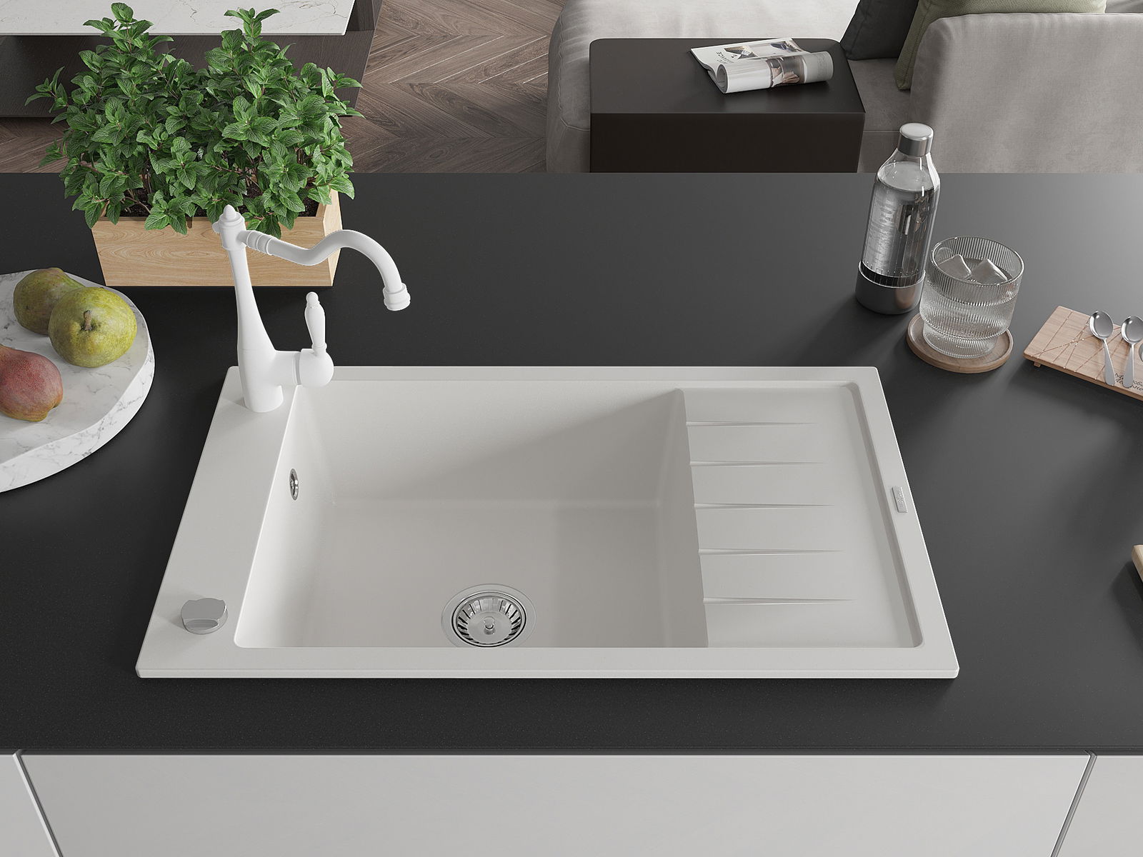 Mexen Elias egymedencés gránit mosogató csepegtetővel és Carla konyhai csapteleppel, fehér - 6511-20-670700-20