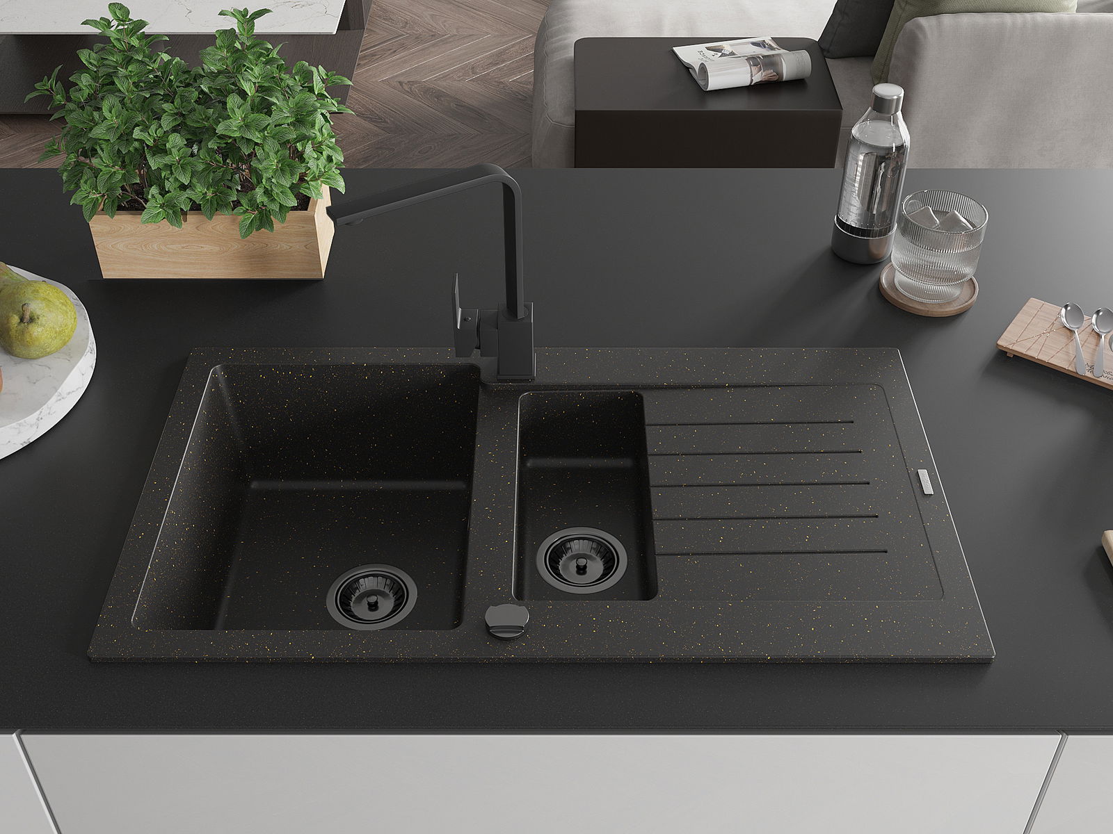 Mexen Matias gránit mosogató, 1,5 medencés csepegtetővel és Rita konyhai csappal, fekete/arany - 6502-75-670300-50-B