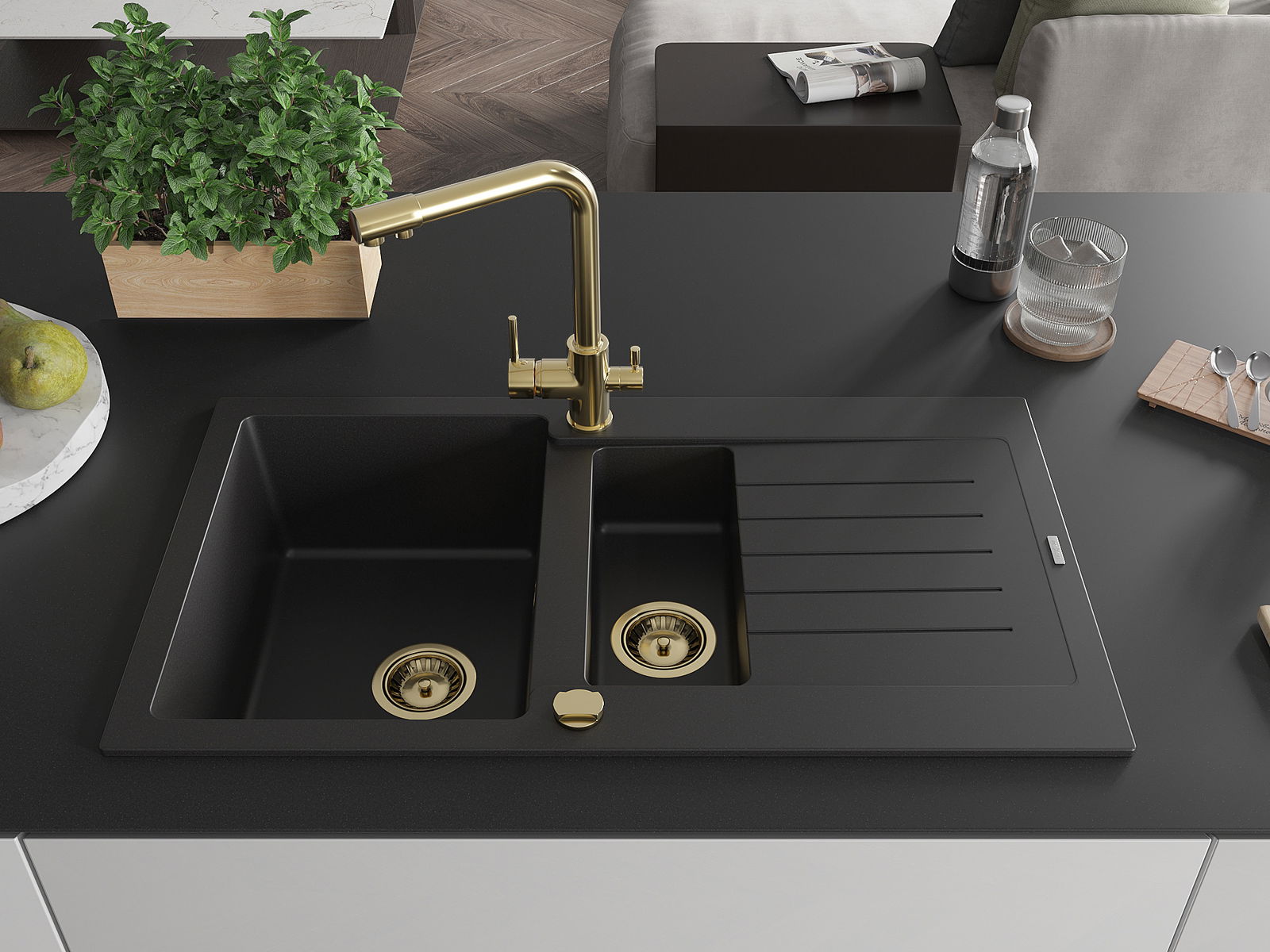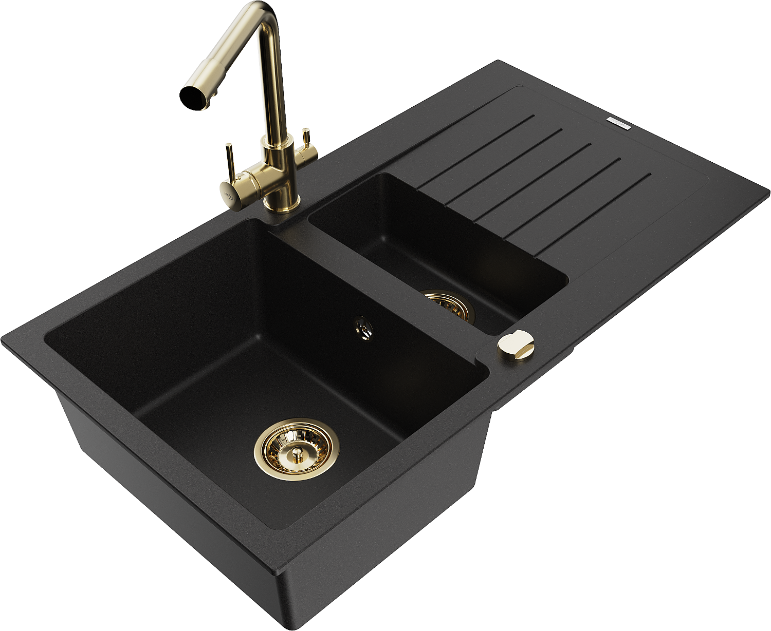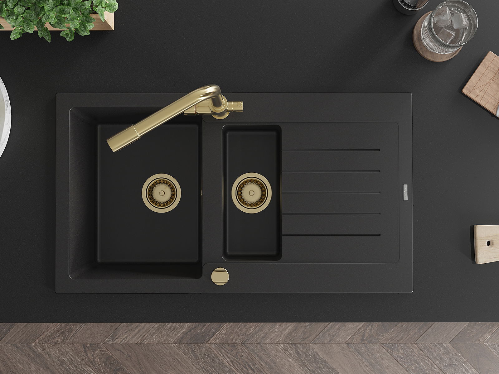 Mexen Matias gránit mosogató 1,5-medencés csepegtetővel és Duero konyhai csapteleppel, fekete - 6502-77-671600-50