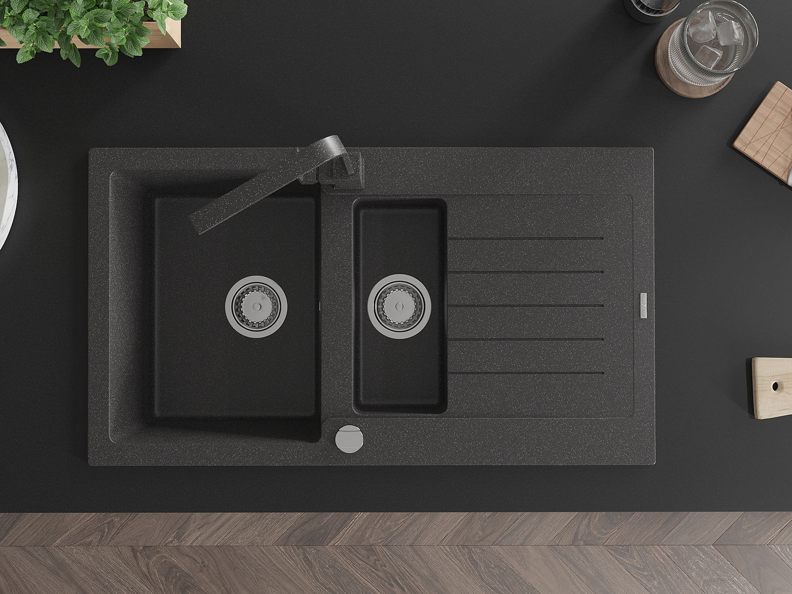A mosogató kiváló minőségű gránitból készül. Ez egy elegáns és mindenekelőtt minden konyhához praktikus kiegészítés, stílusától függetlenül. A kiváló minőségű és a gránit tartósság biztosítja a sok éves használatát.
