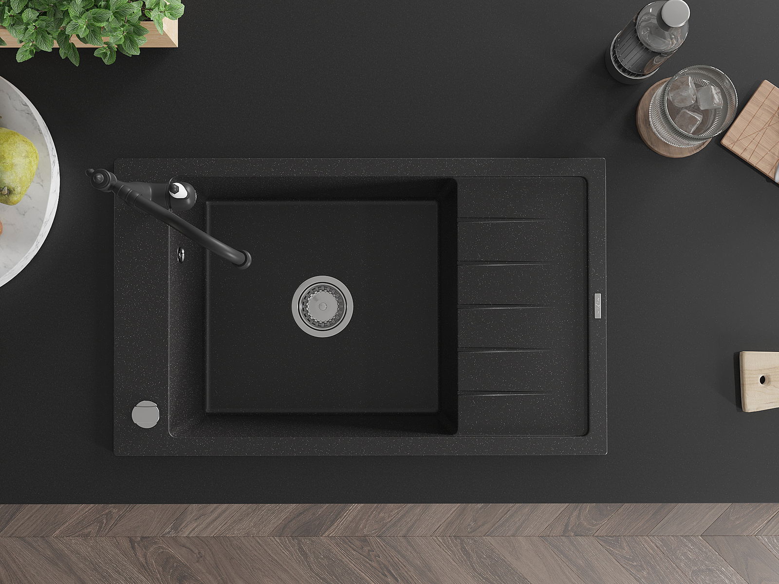 A mosogató kiváló minőségű gránitból készül. Ez egy elegáns és mindenekelőtt minden konyhához praktikus kiegészítés, stílusától függetlenül. A kiváló minőségű és a gránit tartósság biztosítja a sok éves használatát.