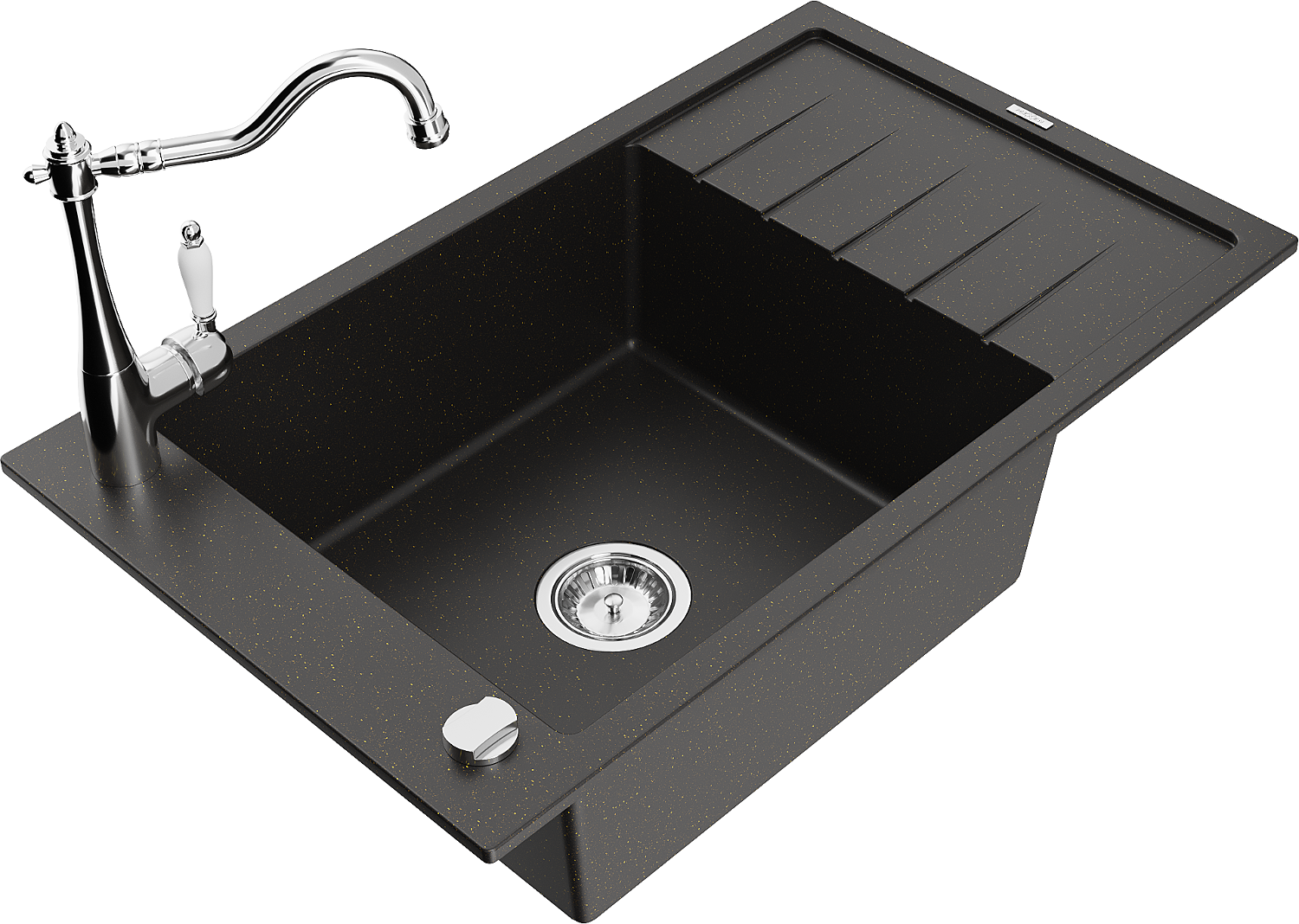 Mexen Elias gránit mosogató 1-medencés csepegtetővel és Carla konyhai csapteleppel, fekete/arany metál - 6511-75-670700-00