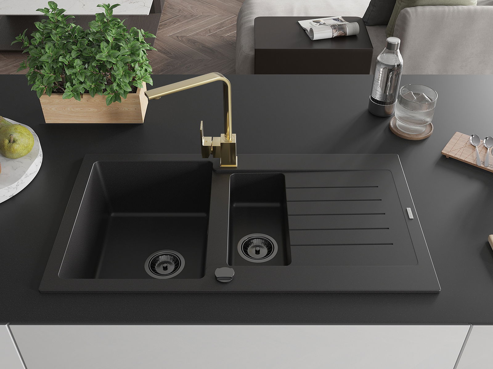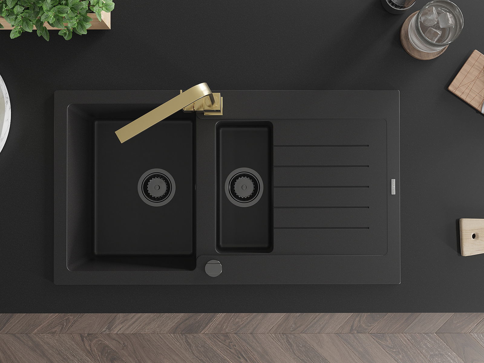 A mosogató 2 összekapcsolt lyukkal rendelkezik, amelynek átmérője 35 mm, önmagában. Felhasználhatók többek között Olyan folyékony adagoló rögzítéséhez, amely kiküszöböli a műanyag palackok jelenlétét a konyhában, és elegáns kivitelben adja meg.
