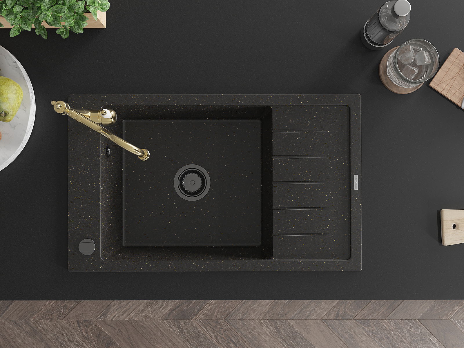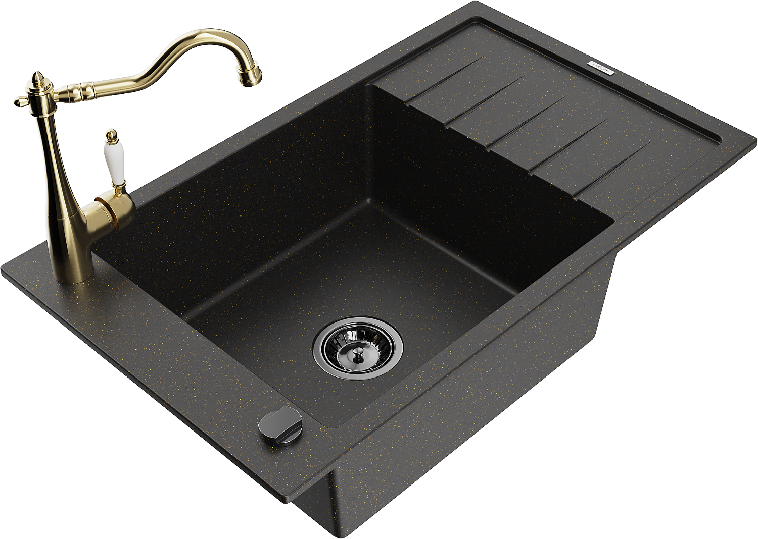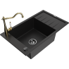 Mexen Elias 1-medencés gránit mosogató leeresztővel és Carla konyhai csapteleppel, fekete/arany metál - 6511-75-670700-50-B