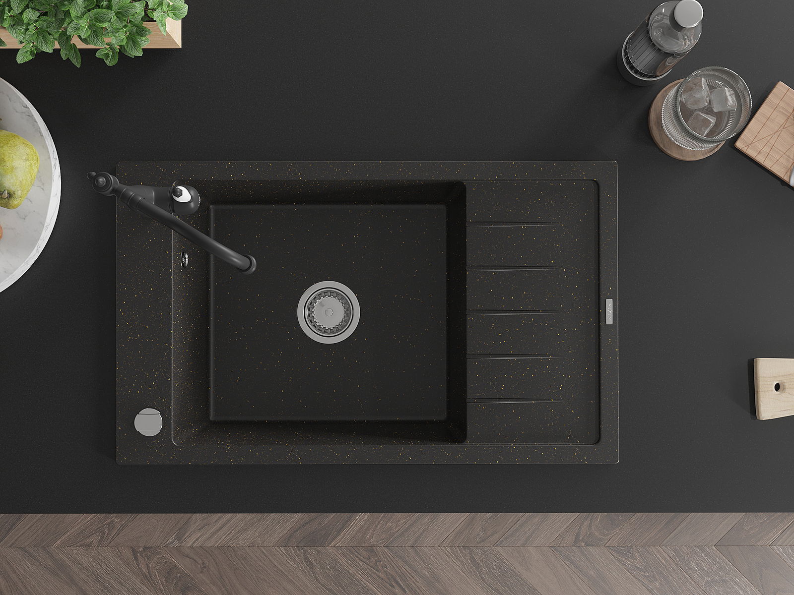 Mexen Elias egymedencés gránit mosogató csepegtetővel és Carla konyhai csapteleppel, fekete/arany metál - 6511-75-670700-70