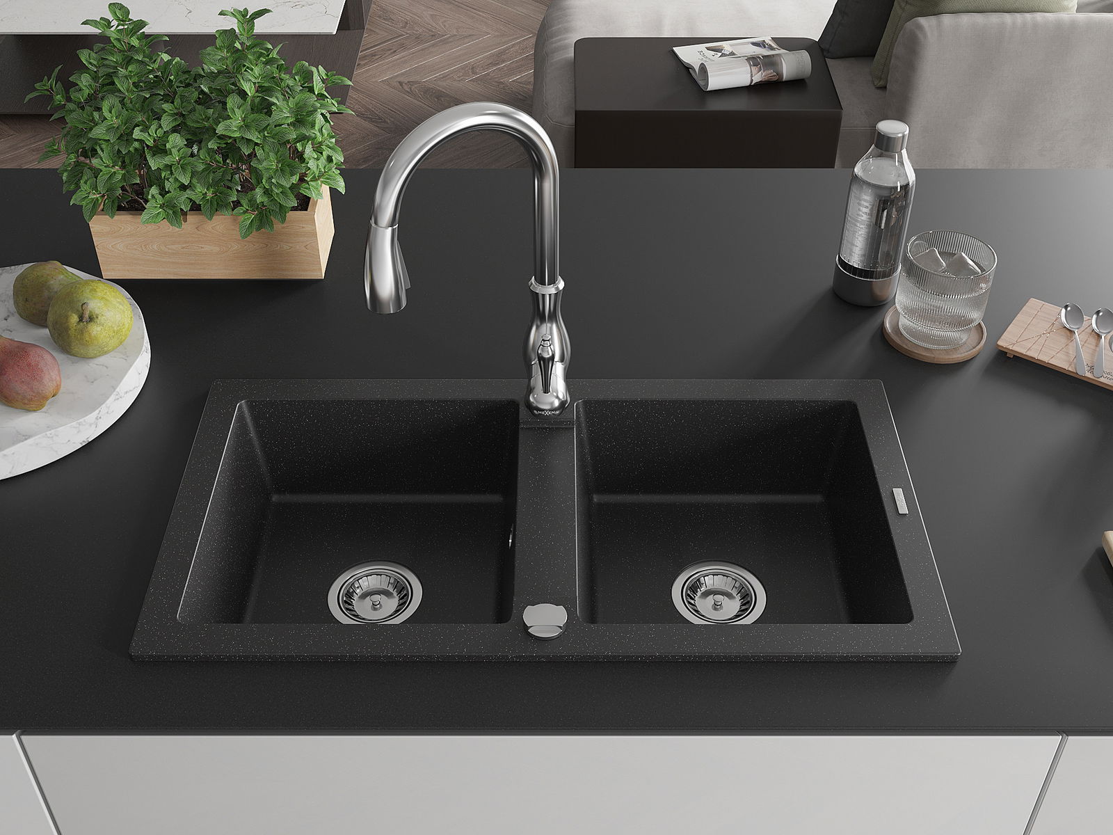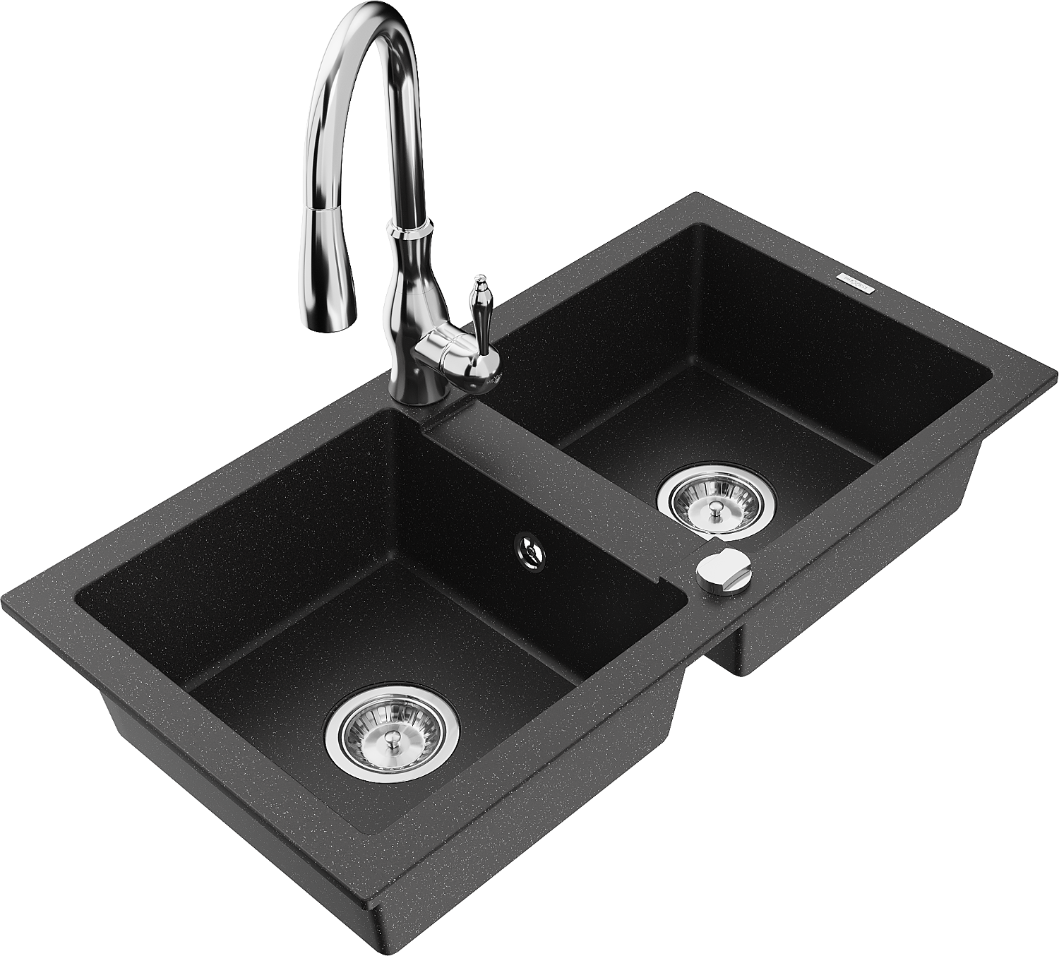 Mexen Mario gránit konyhai mosogató 2 rekeszes Savita csapteleppel, fekete/ezüst metál - 6504-73-672601-00