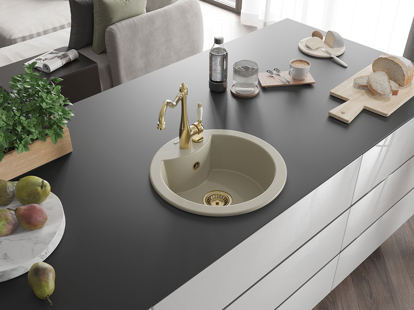 A mosogató kiváló minőségű gránitból készül. Ez egy elegáns és mindenekelőtt minden konyhához praktikus kiegészítés, stílusától függetlenül. A kiváló minőségű és a gránit tartósság biztosítja a sok éves használatát.