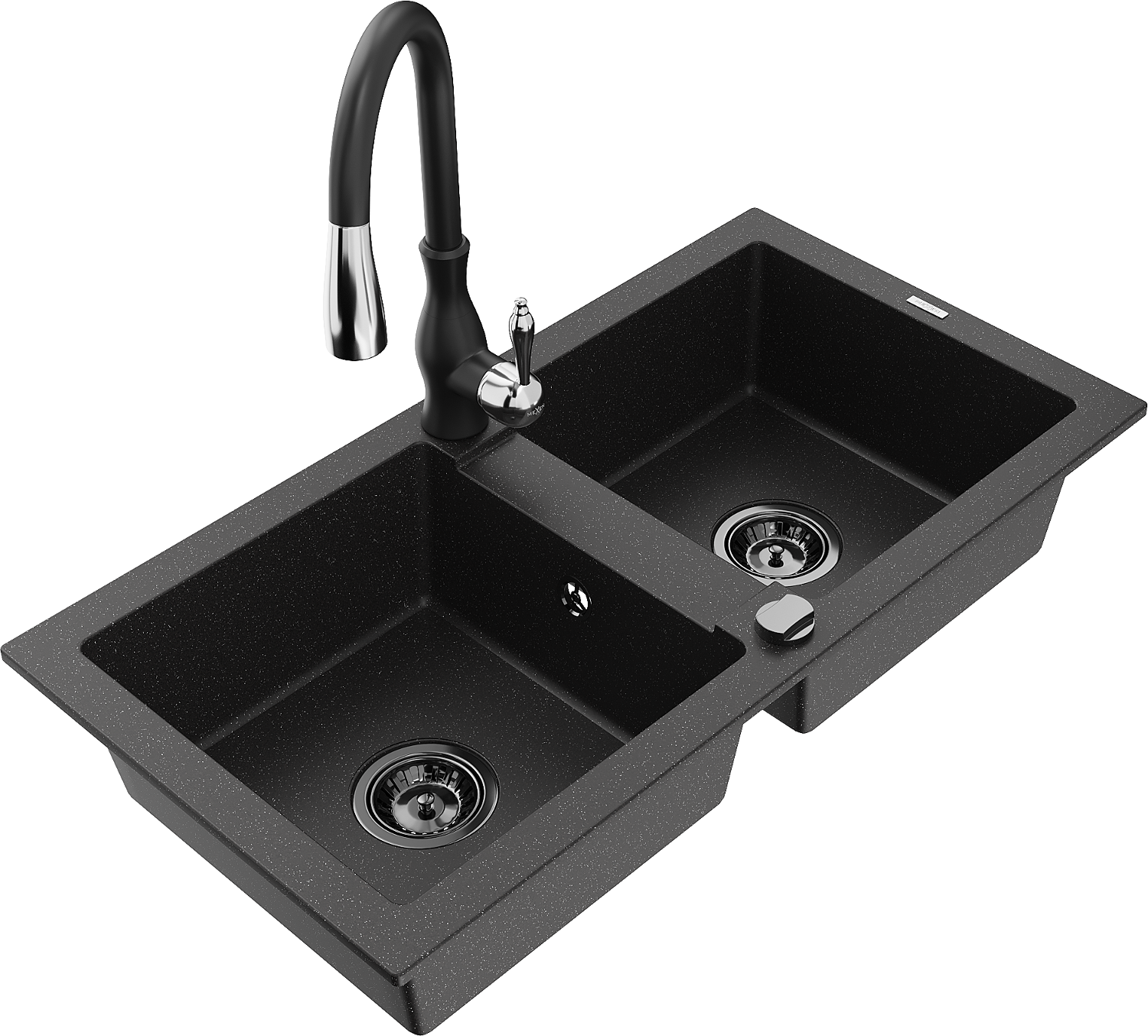 Mexen Mario gránit mosogató kétmedencés konyhai csappal Savita, fekete/ezüst metál - 6504-73-672601-70-B