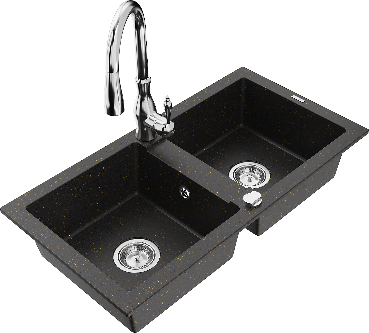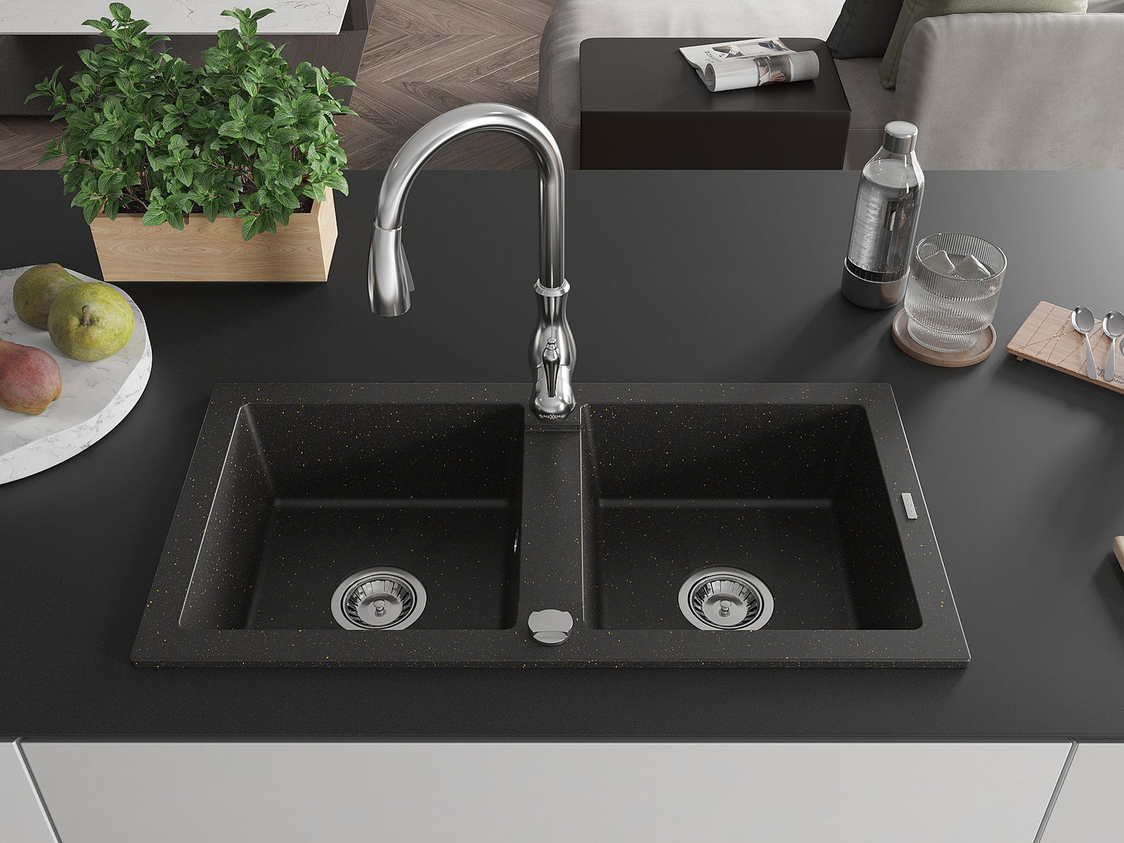 Mexen Mario gránit mosogatótál 2 rekeszes konyhai csapteleppel Savita, fekete/arany metál - 6504-75-672601-00