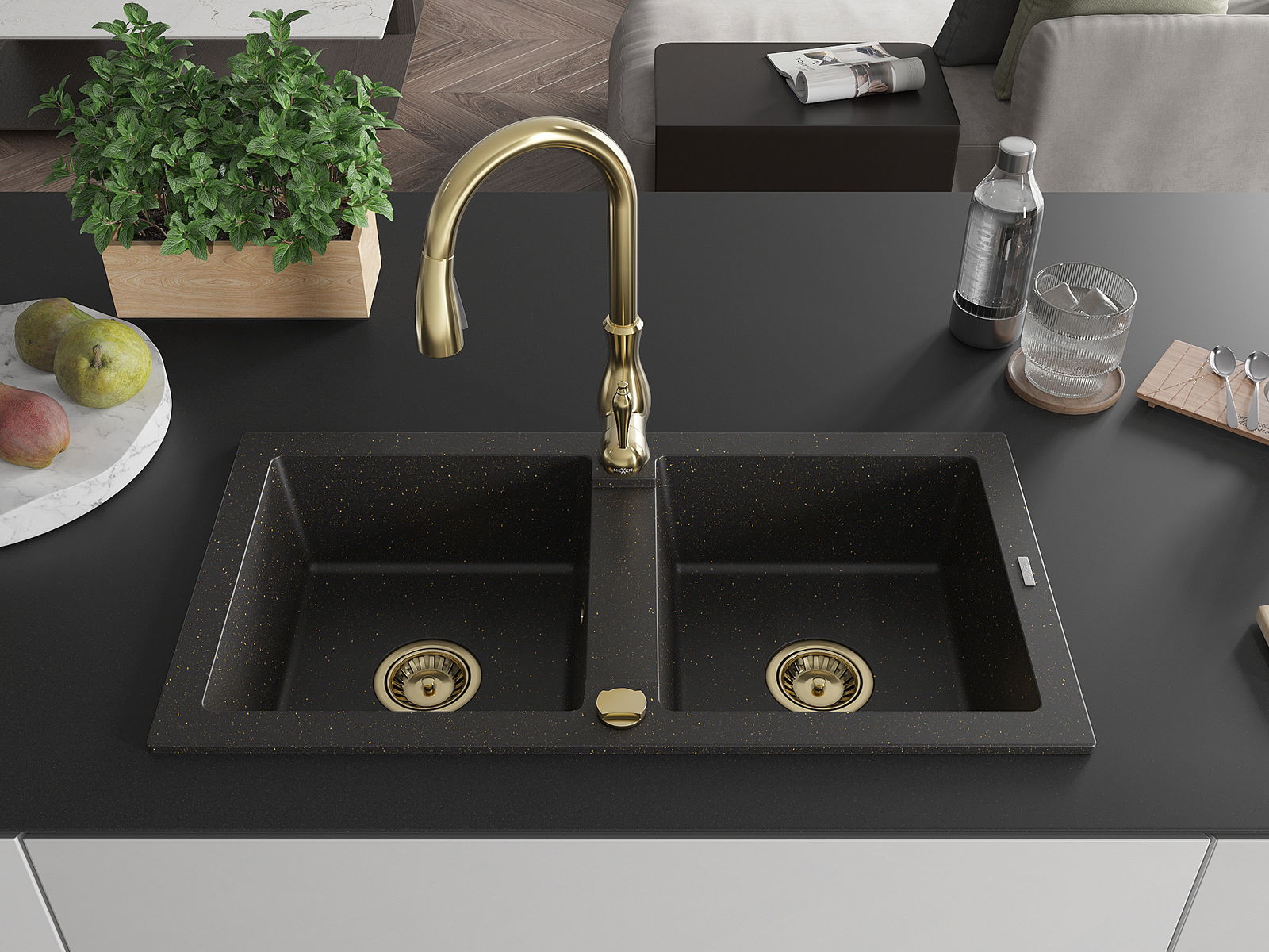 Mexen Mario 2 kamrás gránit mosogató Savita konyhai csapteleppel, fekete/arany metál - 6504-75-672601-50