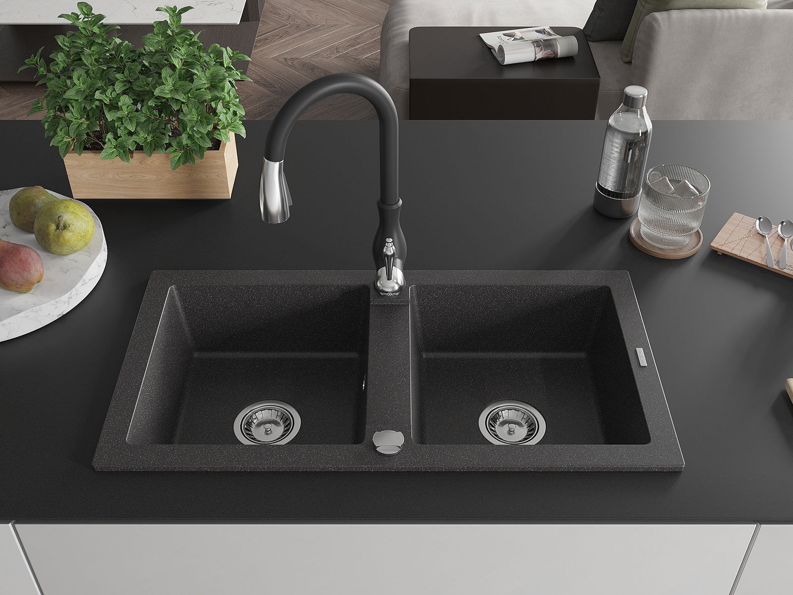 Mexen Mario gránit 2-medencés mosogató konyhai csappal Savita, fekete pöttyös - 6504-76-672601-70