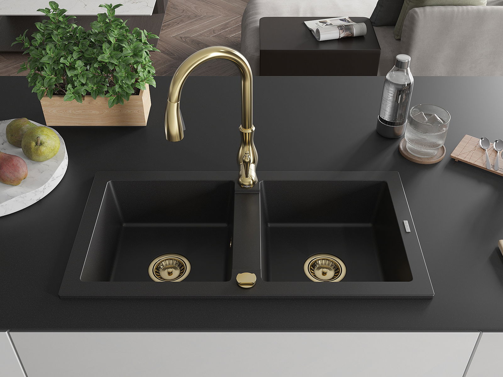 Mexen Mario 2 rekeszes gránit mosogató Savita konyhai csappal, fekete - 6504-77-672601-50