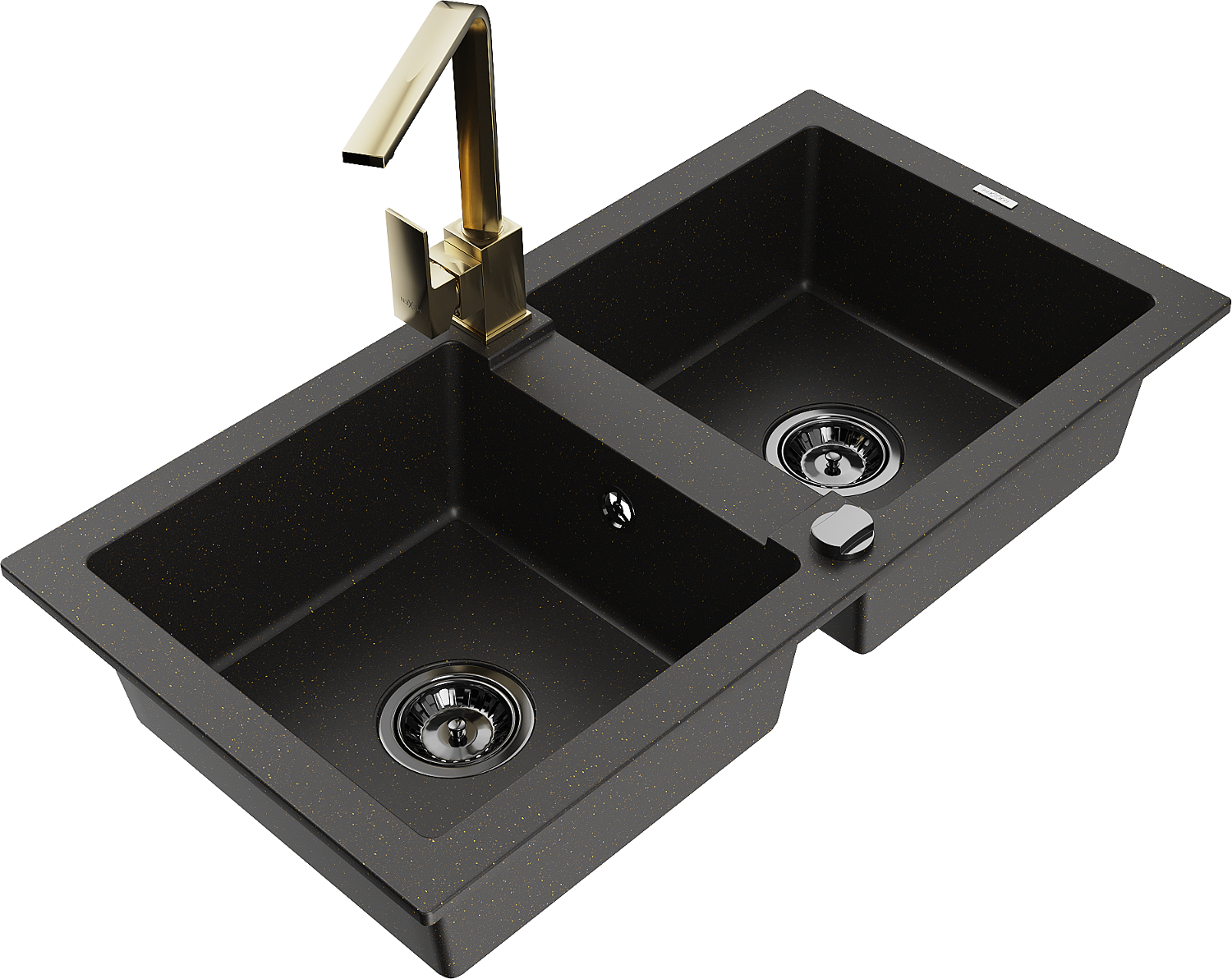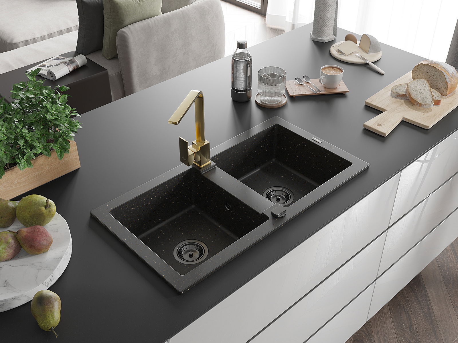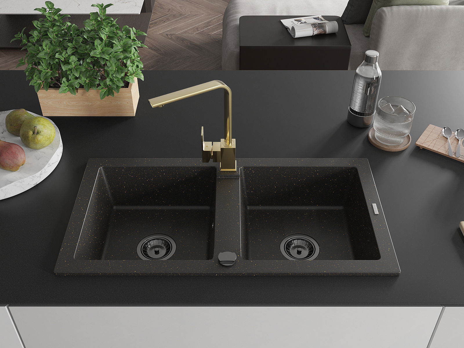 Mexen Mario gránit mosogató 2 rekeszes Rita konyhai csapteleppel, fekete/arany metál - 6504-75-670300-50-B
