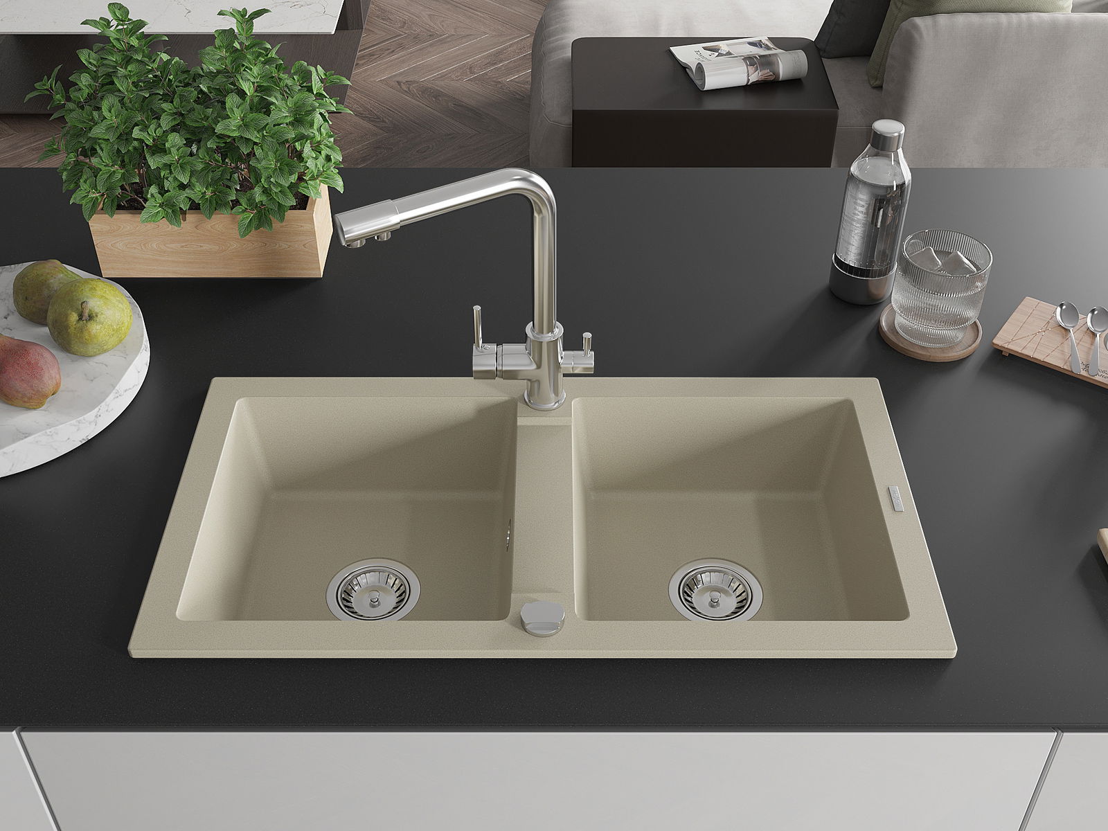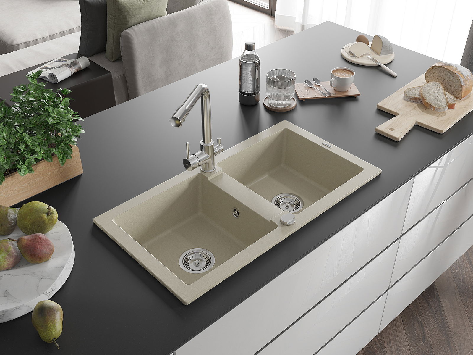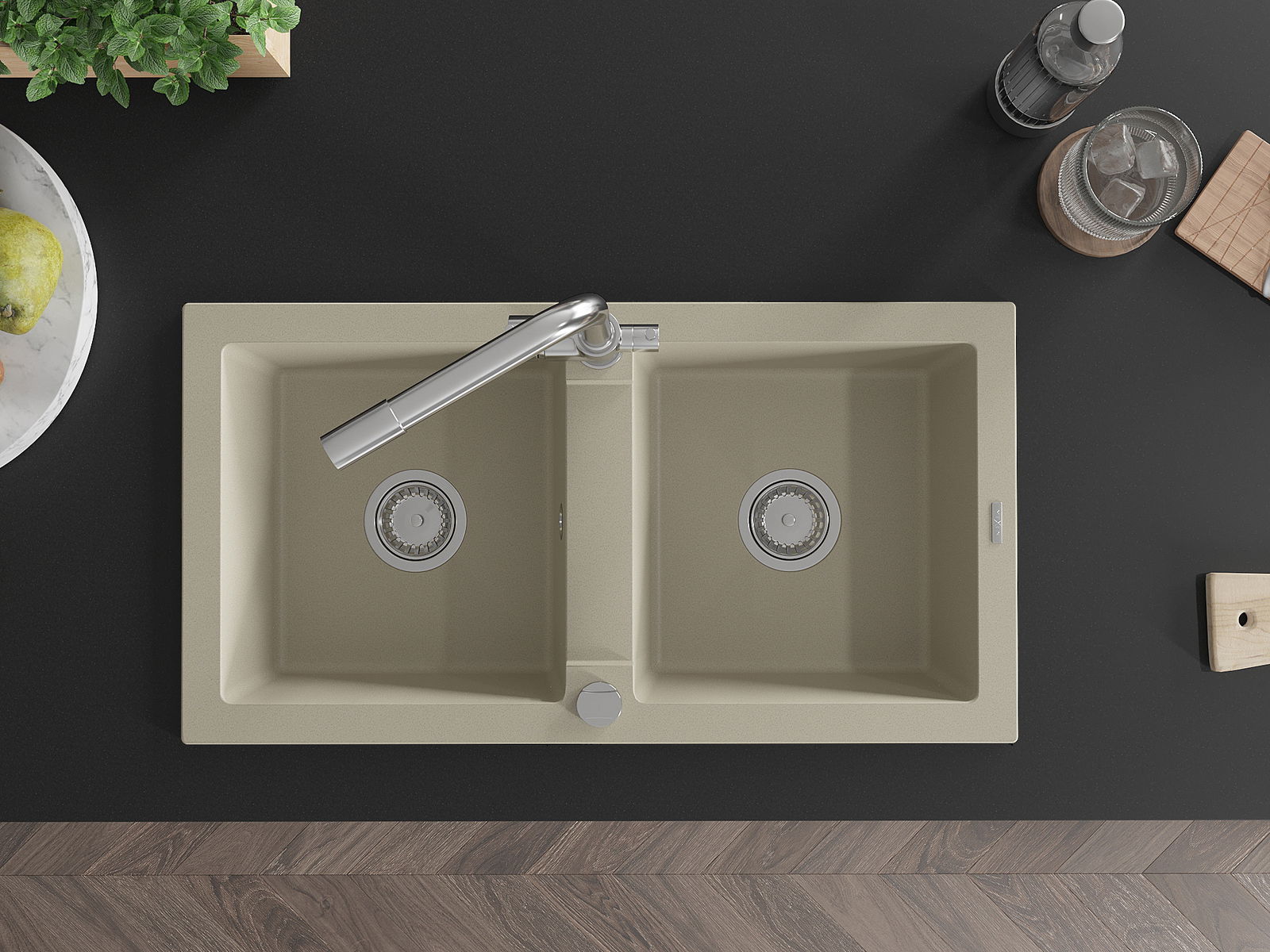 Mexen Mario kétkamrás gránit mosogató Duero konyhai csappal, bézs - 6504-69-671600-00