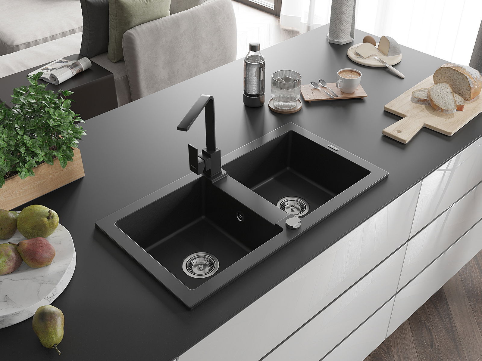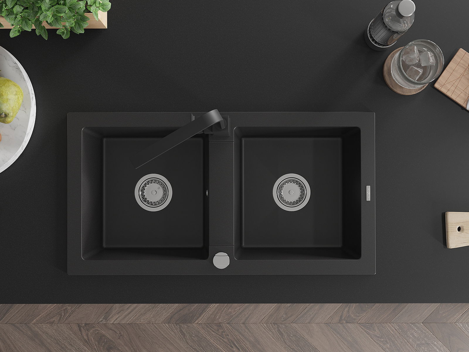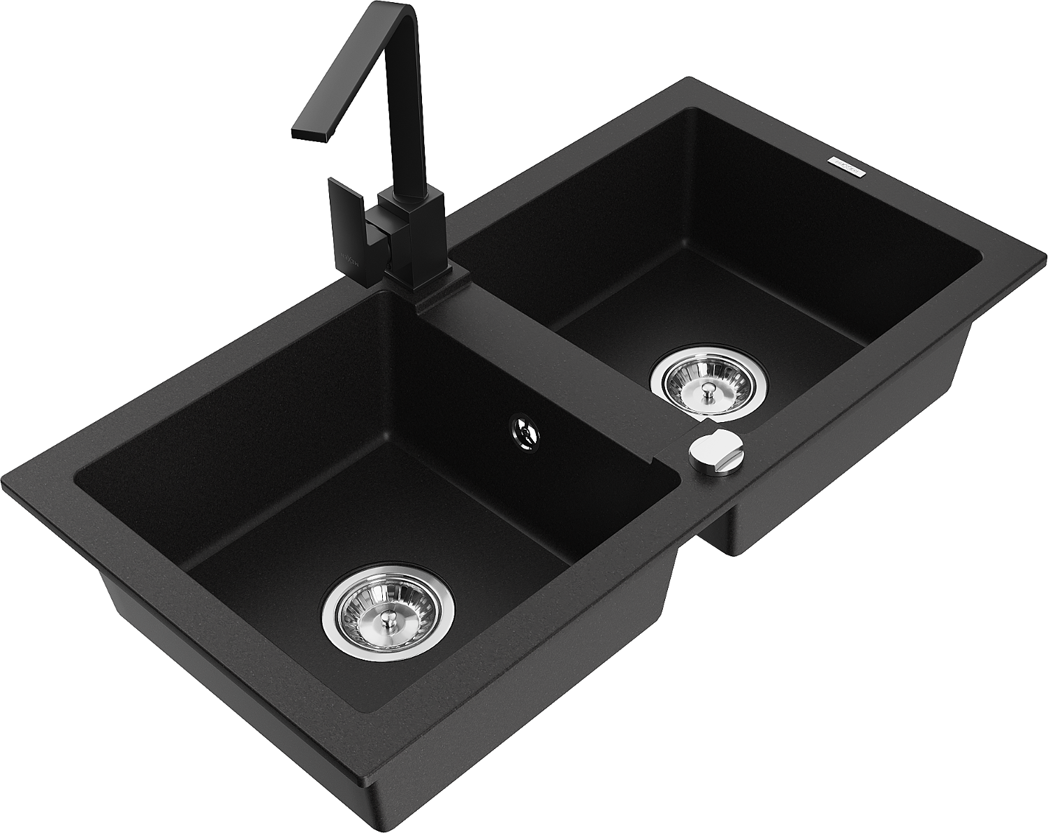 Mexen Mario 2 rekeszes gránit mosogató Rita konyhai csappal, fekete - 6504-77-670300-70