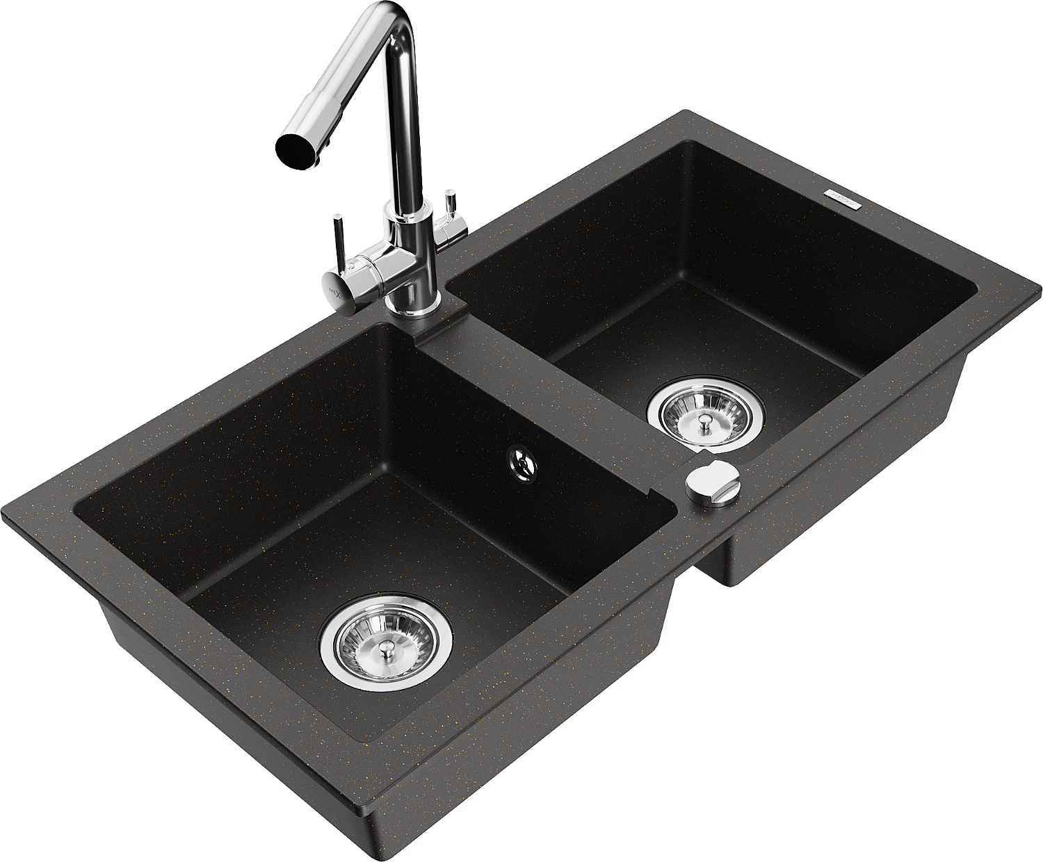 Mexen Mario 2 rekeszes gránit mosogató Duero konyhai csapteleppel, fekete/arany metál - 6504-75-671600-00