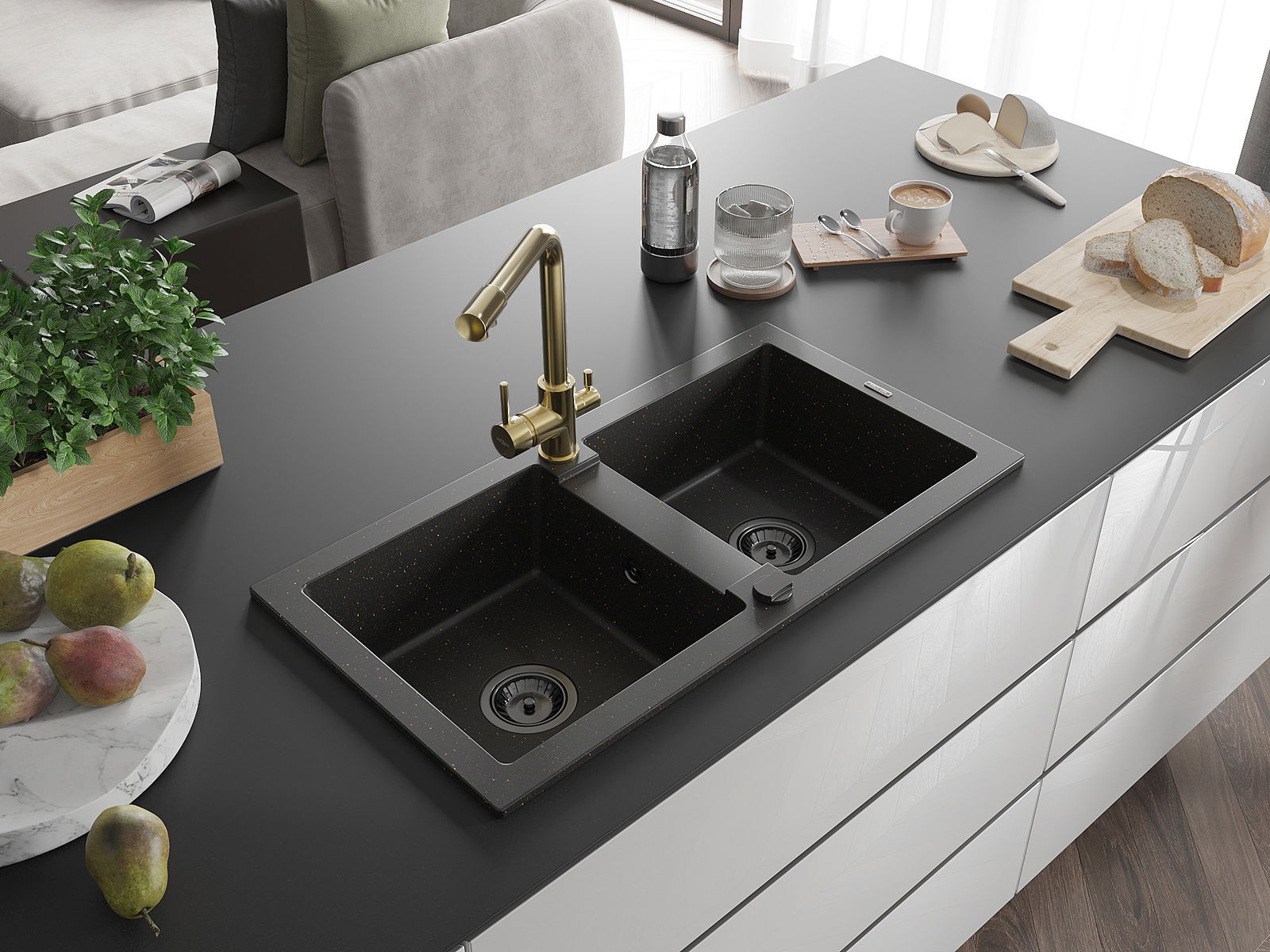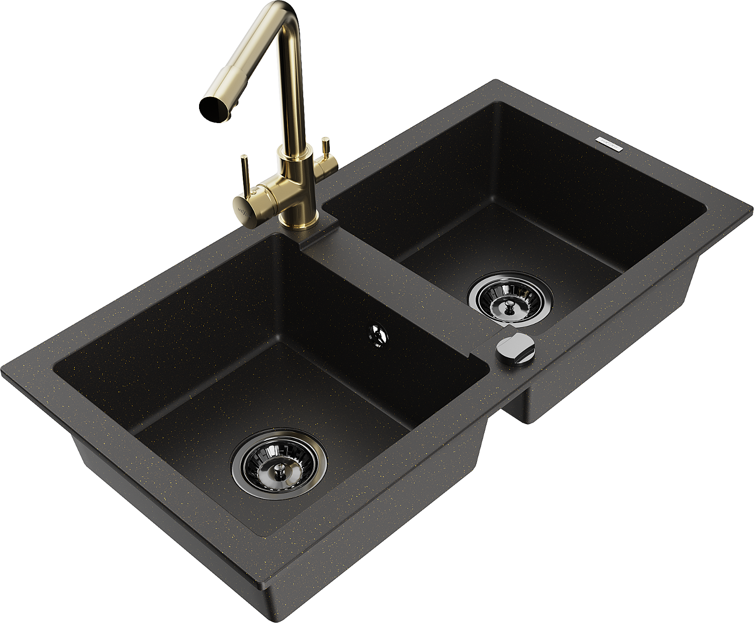 Mexen Mario gránit kétmedencés mosogató Duero konyhai csappal, fekete/arany metál - 6504-75-671600-50-B