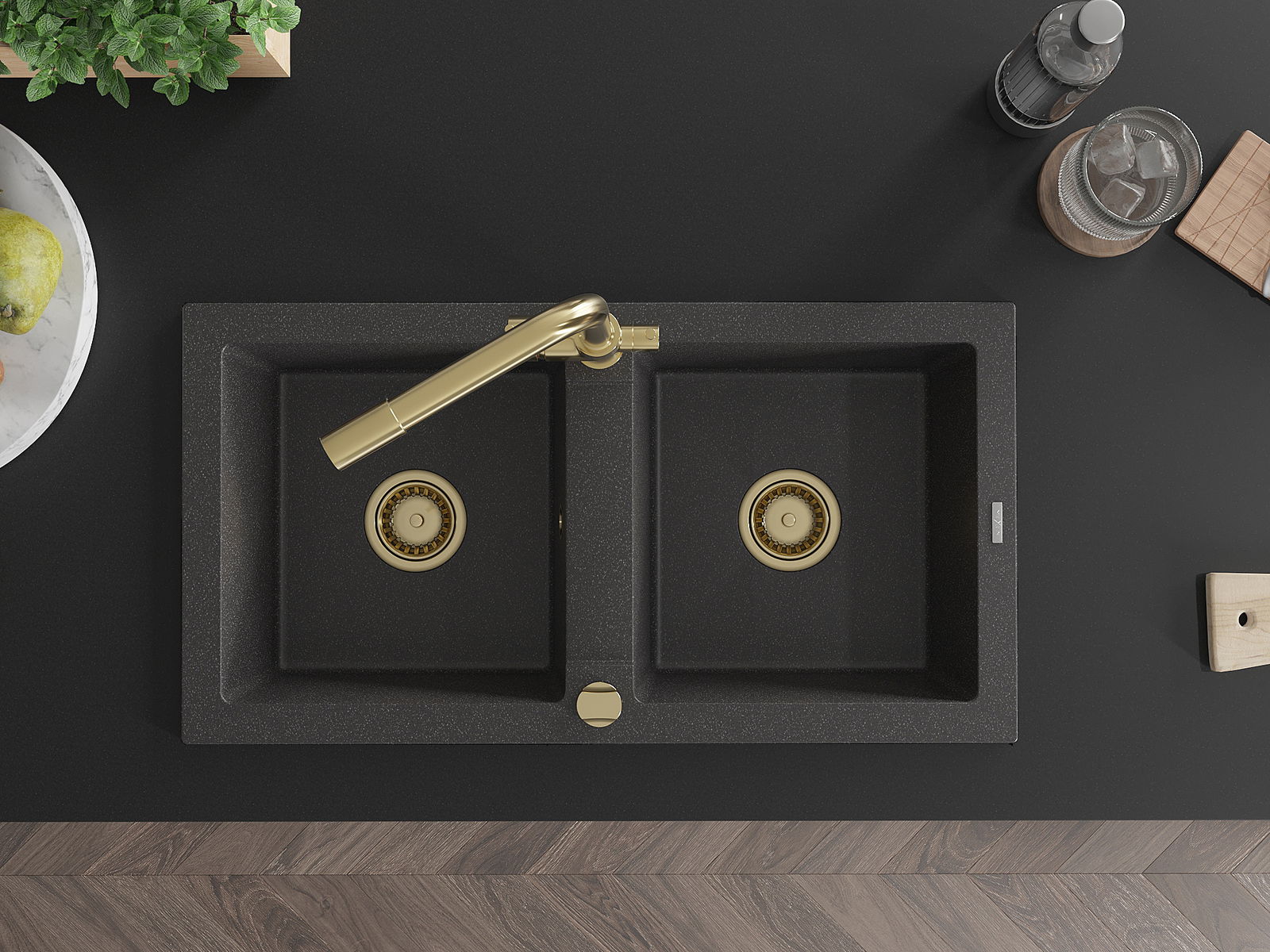 Mexen Mario 2 rekeszes gránit mosogató Duero konyhai csapteleppel, fekete pöttyös - 6504-76-671600-50