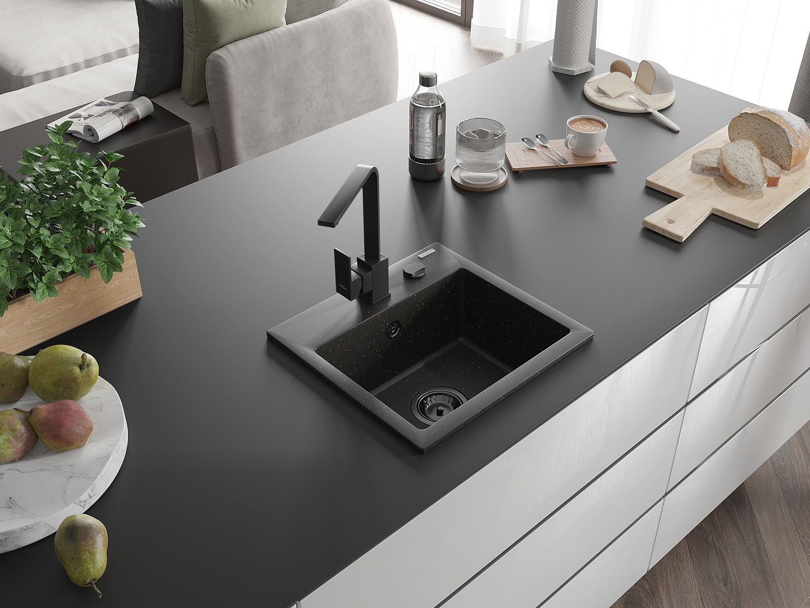A mosogató kiváló minőségű gránitból készül. Ez egy elegáns és mindenekelőtt minden konyhához praktikus kiegészítés, stílusától függetlenül. A kiváló minőségű és a gránit tartósság biztosítja a sok éves használatát.