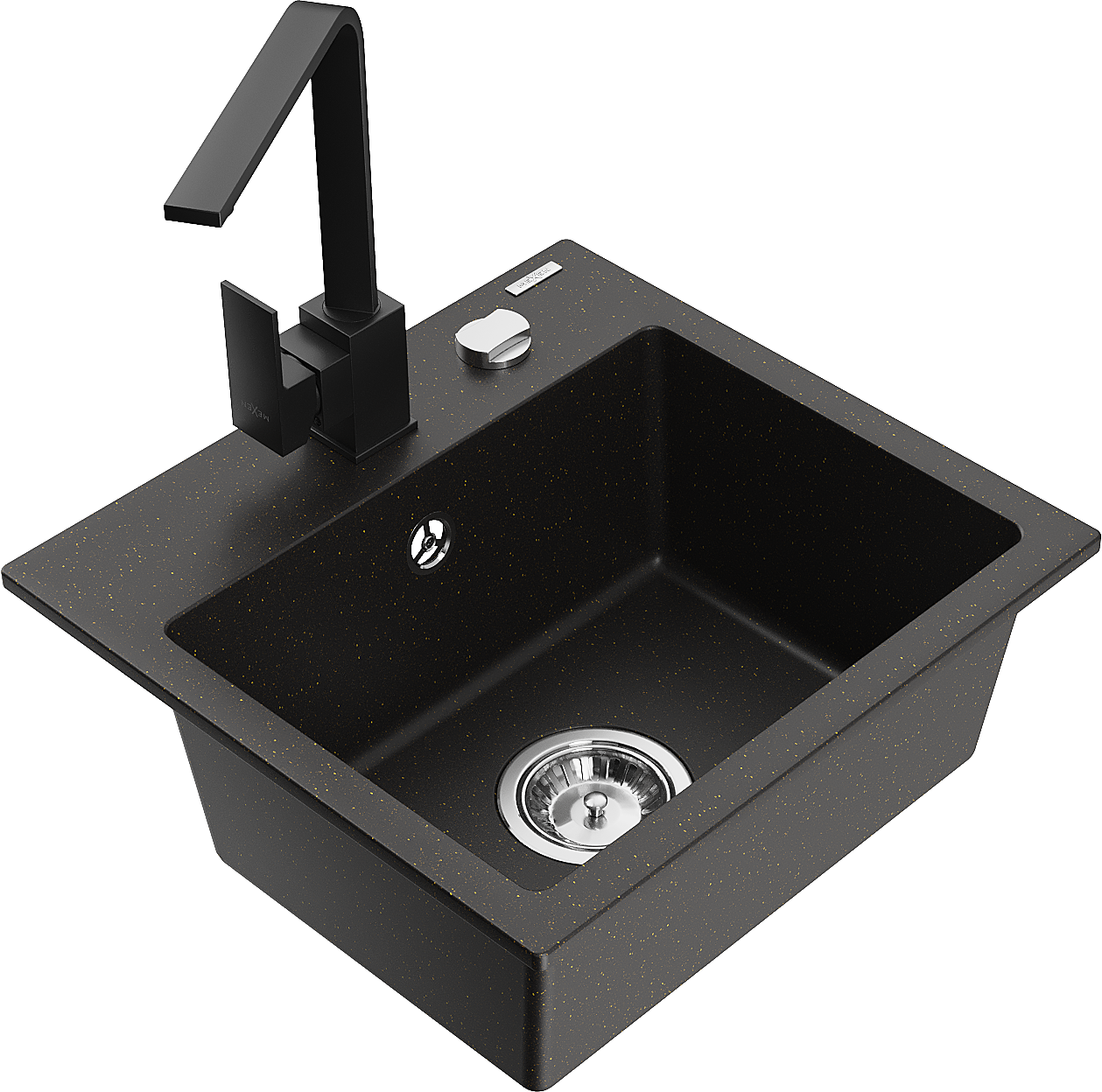 Mexen Milo egymedencés gránit mosogató Rita konyhai csapteleppel, fekete/arany metál - 6505-75-670300-70