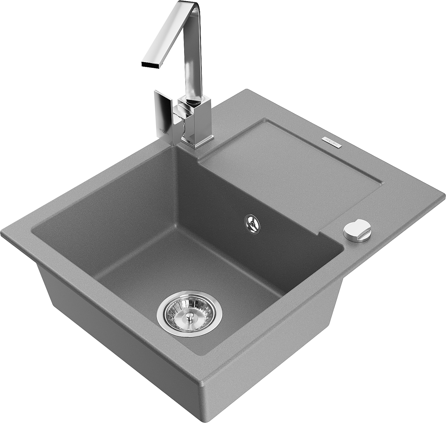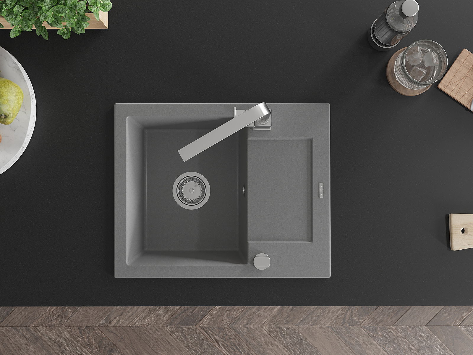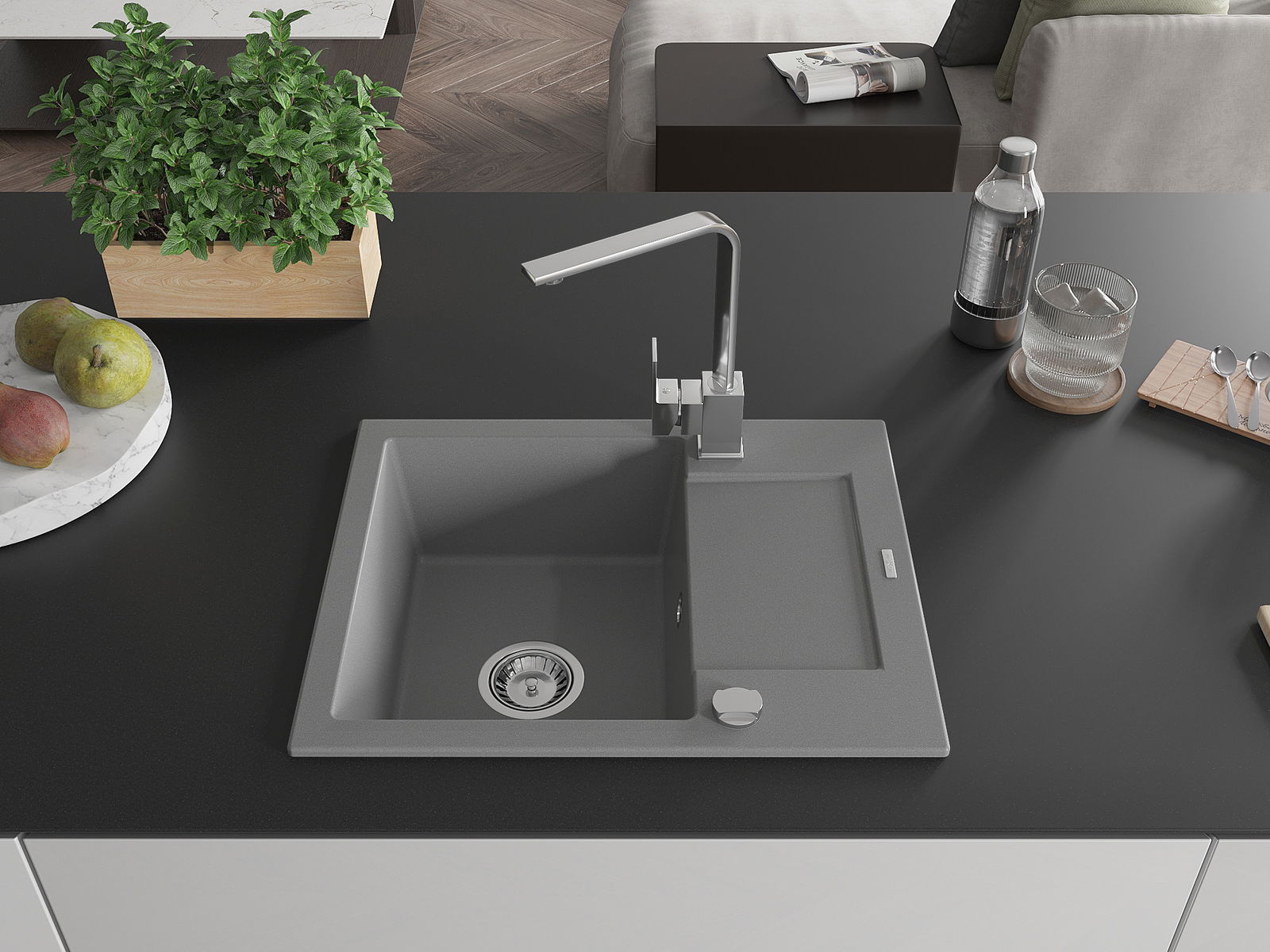 Mexen Enzo egymedencés gránit mosogató csepegtetővel és Rita konyhai csapteleppel, szürke - 6506-71-670300-00