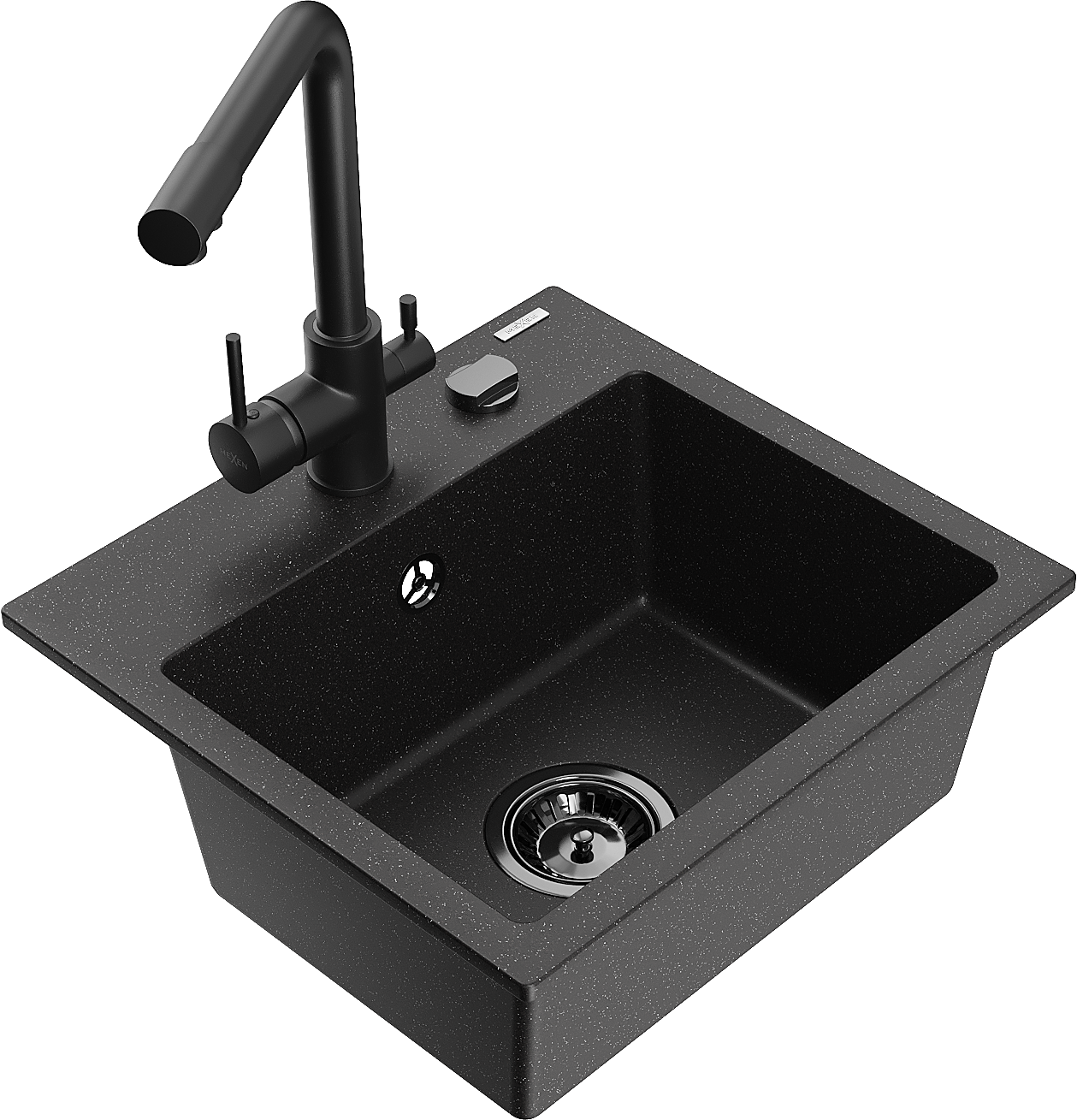 Mexen Milo 1-kamrás gránit mosogató Duero konyhai csapteleppel, fekete/ezüst metál - 6505-73-671600-70-B