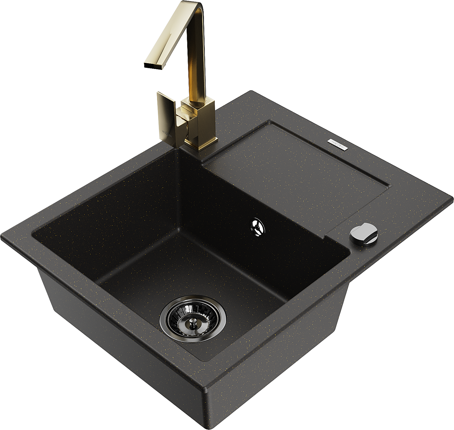 Mexen Enzo egymedencés gránit mosogató csepegtetővel és Rita konyhai csaptelep, fekete/arany metál - 6506-75-670300-50-B