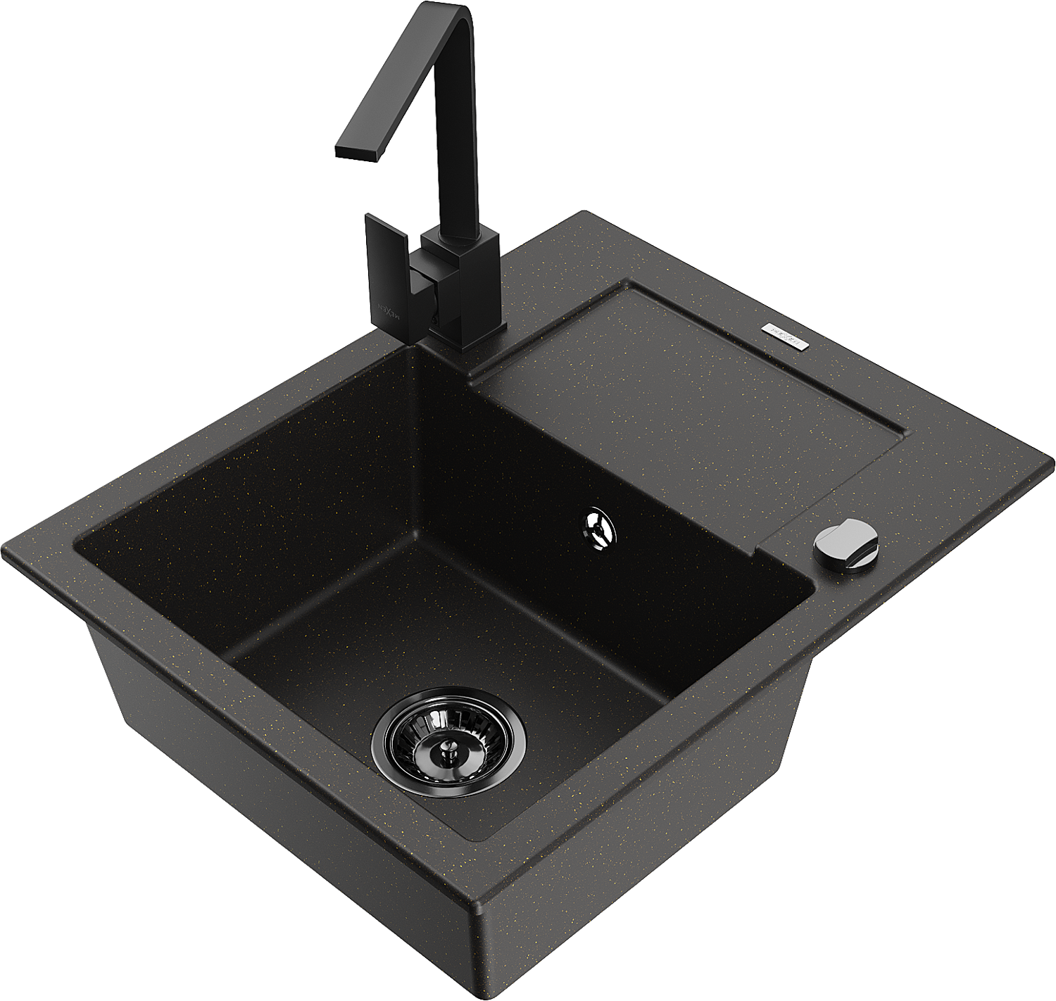 Mexen Enzo gránit mosogató, 1-medencés lefolyóval és Rita konyhai csappal, fekete/arany metál - 6506-75-670300-70-B