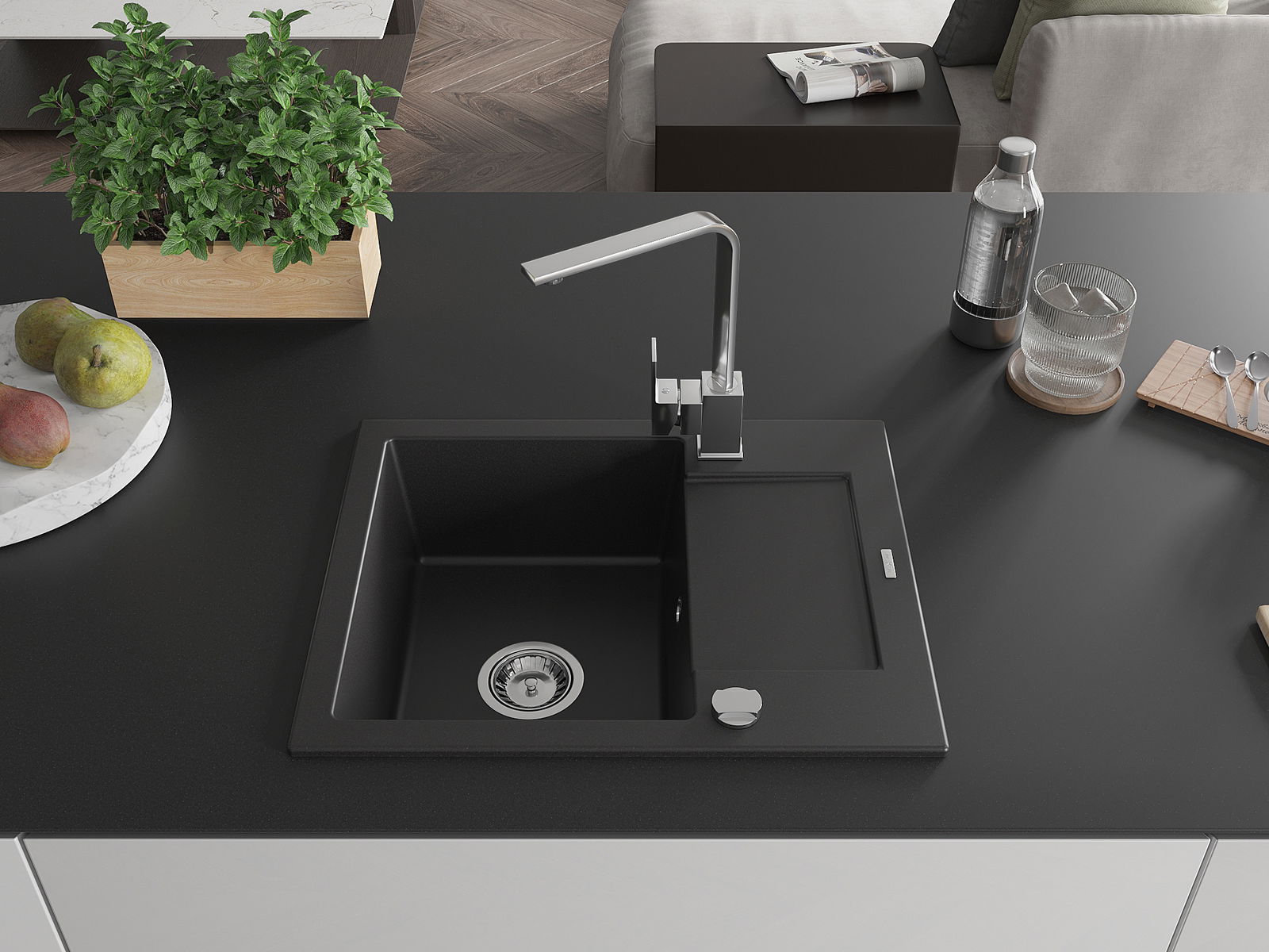A mosogató magas minőségű gránitból készült. Elegáns, de mindenekelőtt praktikus kiegészítője minden konyhának, függetlenül annak stílusától. A gránit magas minősége és tartóssága hosszú távú használatot biztosít.