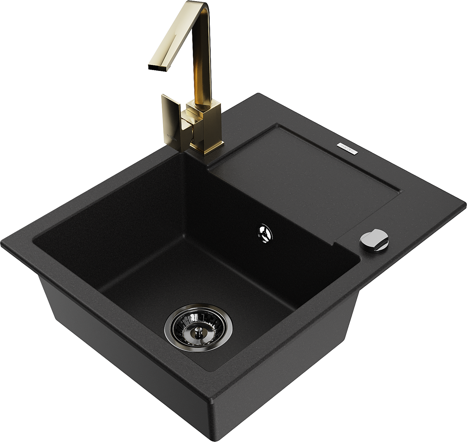Mexen Enzo egymedencés gránit mosogató csepegtetővel és Rita konyhai csapteleppel, fekete - 6506-77-670300-50-B