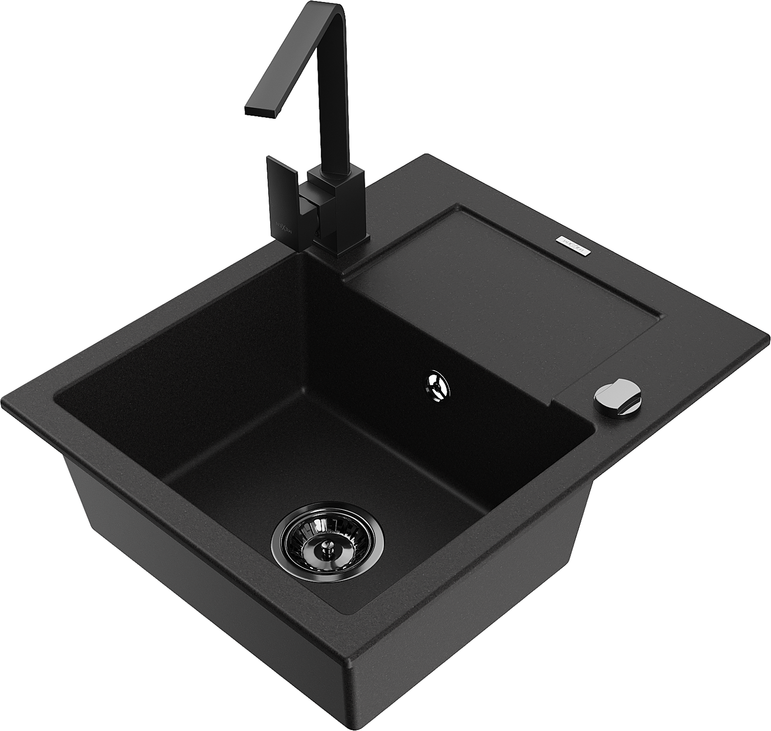 Mexen Enzo gránit mosogató 1-medencés csepegtetővel és Rita konyhai csapteleppel, fekete - 6506-77-670300-70-B