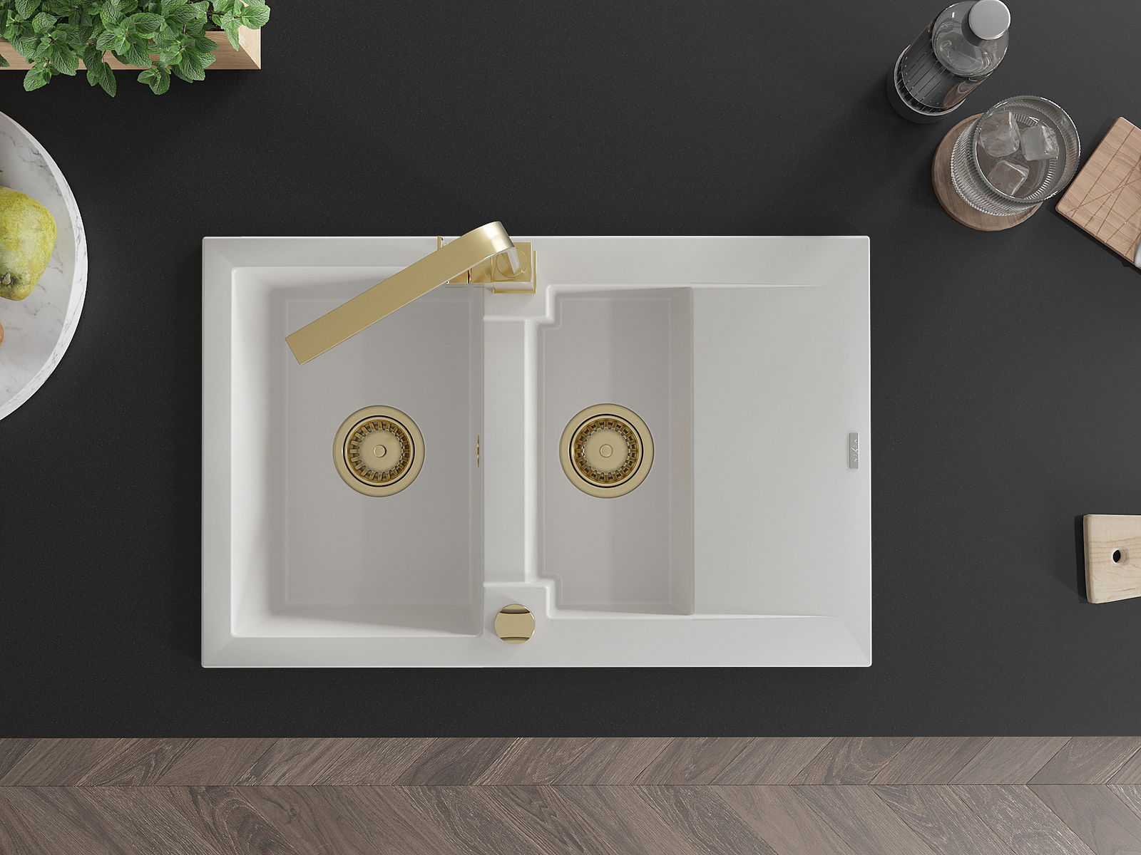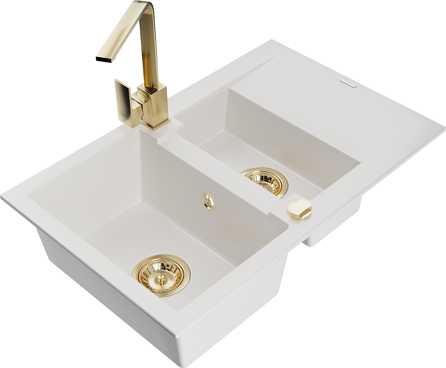 Mexen Gaspar gránit mosogató 1,5 rekeszes csepegtetővel és Rita konyhai csappal, fehér - 6507-20-670300-50