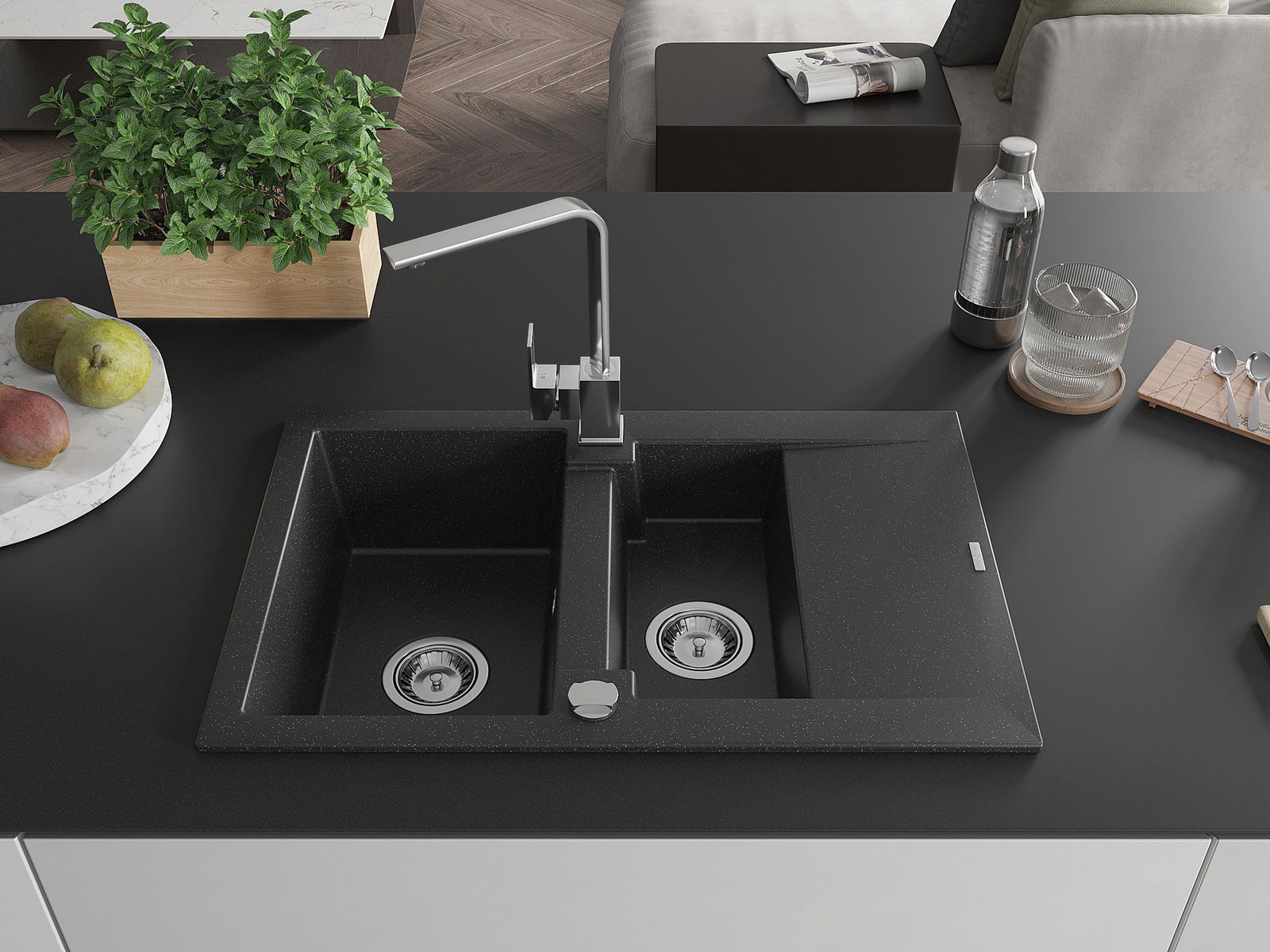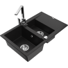 Mexen Gaspar gránit mosogató 1,5 medencés csepptálcával és Rita konyhai csappal, fekete/ezüst metál - 6507-73-670300-00