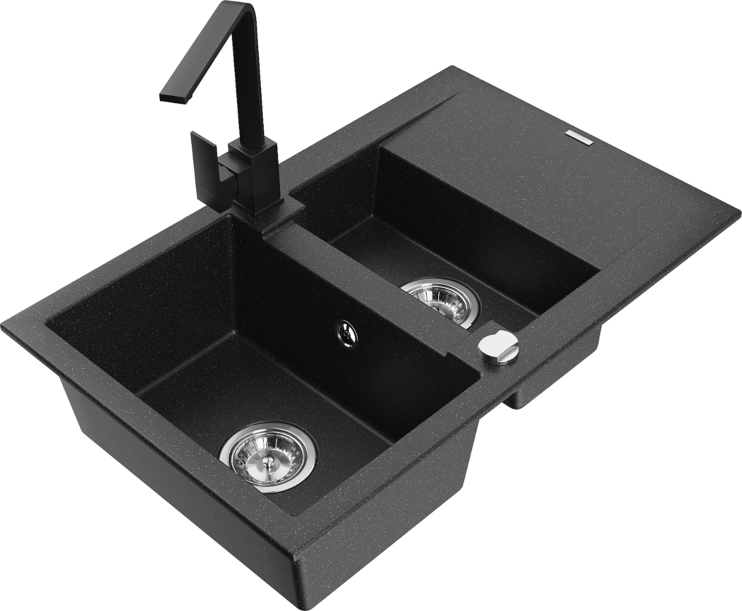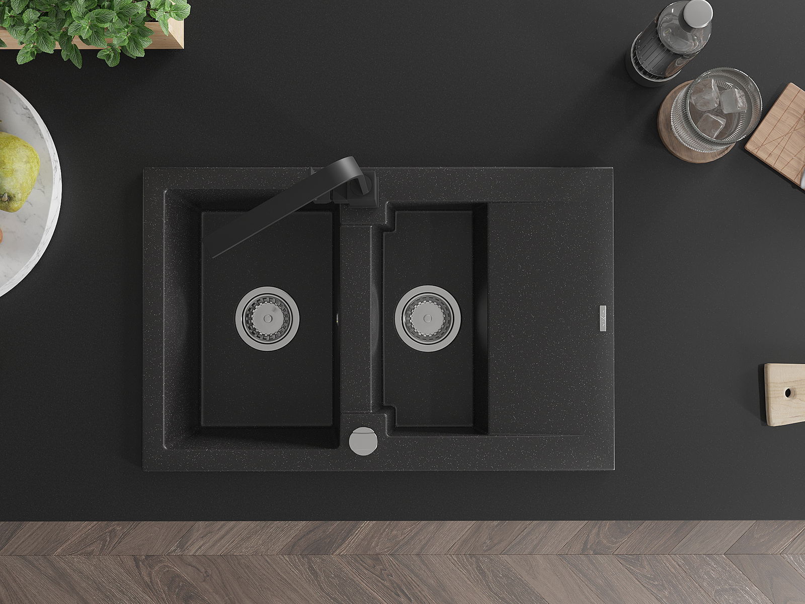 Mexen Gaspar gránit mosogató 1,5 medencés csepegtetővel és Rita konyhai csapteleppel, fekete/ezüst metál - 6507-73-670300-70