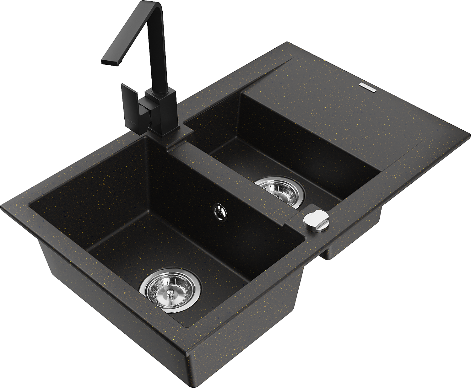 Mexen Gaspar gránit mosogató 1,5 kamrás csöpögtetővel és Rita konyhai csapteleppel, fekete/arany - 6507-75-670300-70